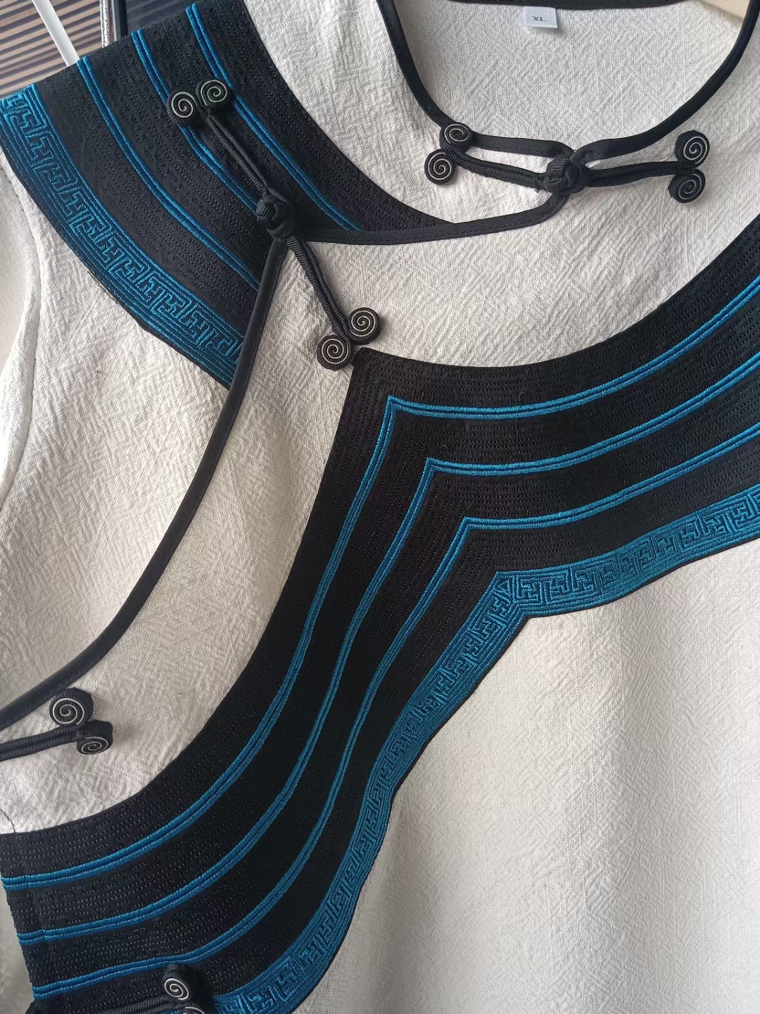 新款凉山西昌彝族男装上衣棉麻白色蓝色刺绣花条纹阿都少数民族风