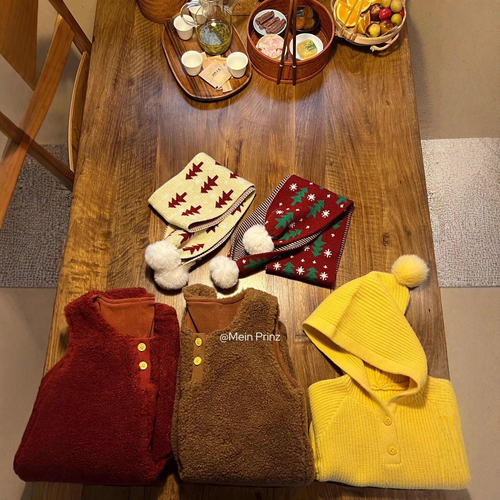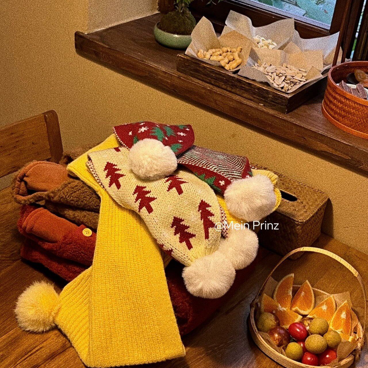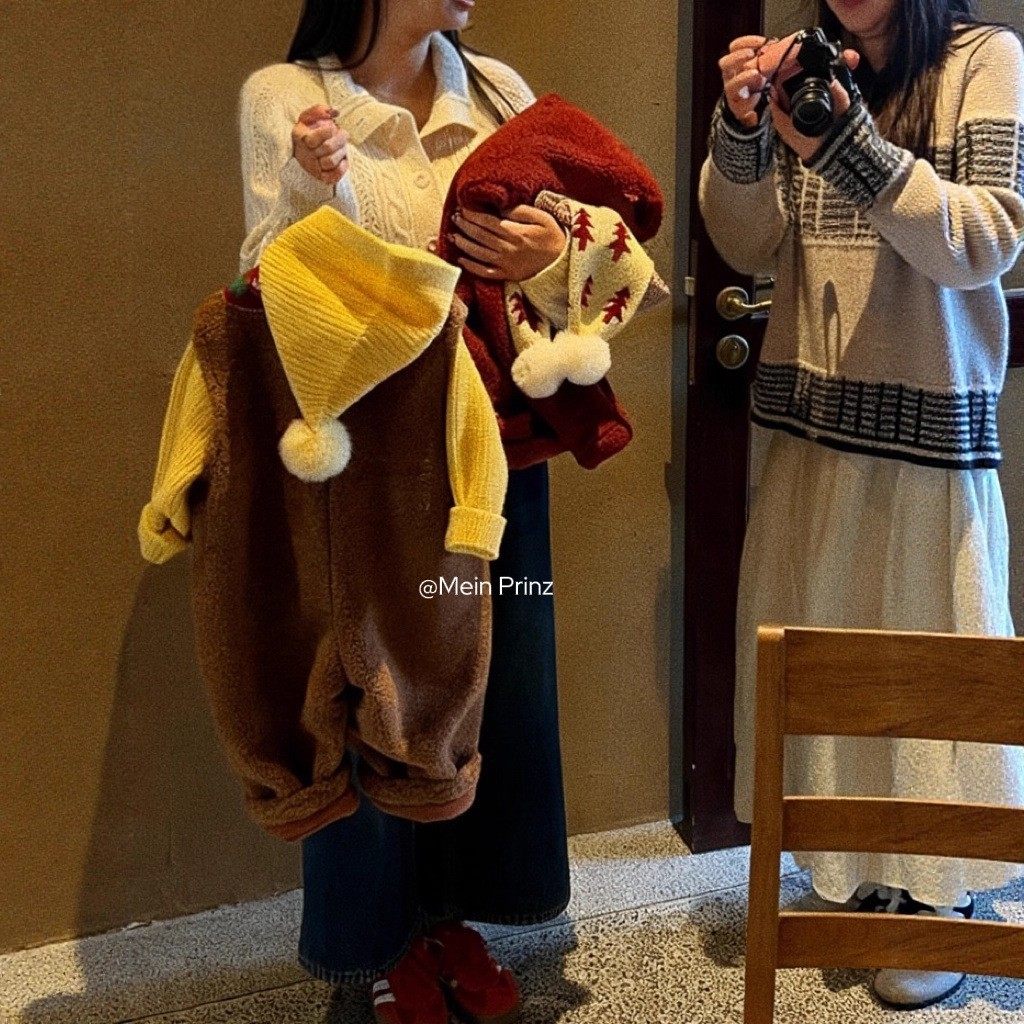 儿童冬季2025羊羔绒背带连体裤套装男童女童拜年服精灵帽毛衣围巾