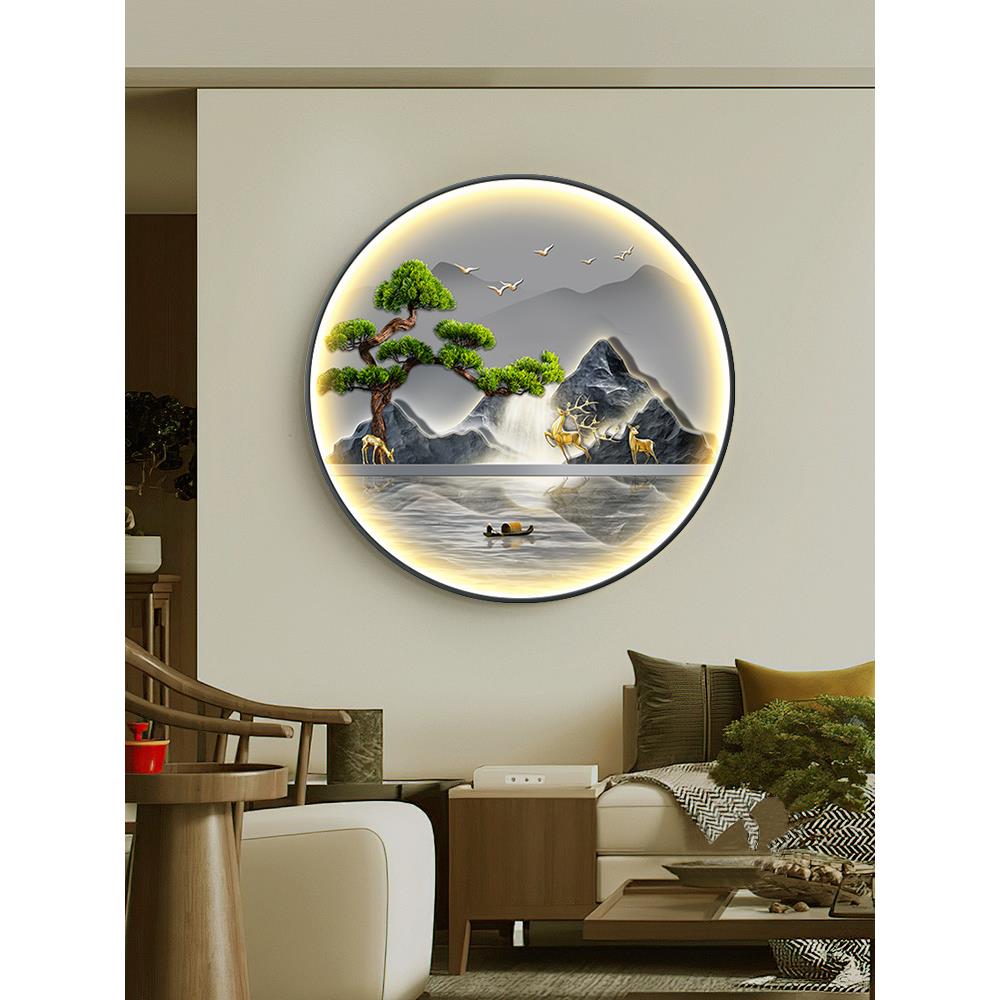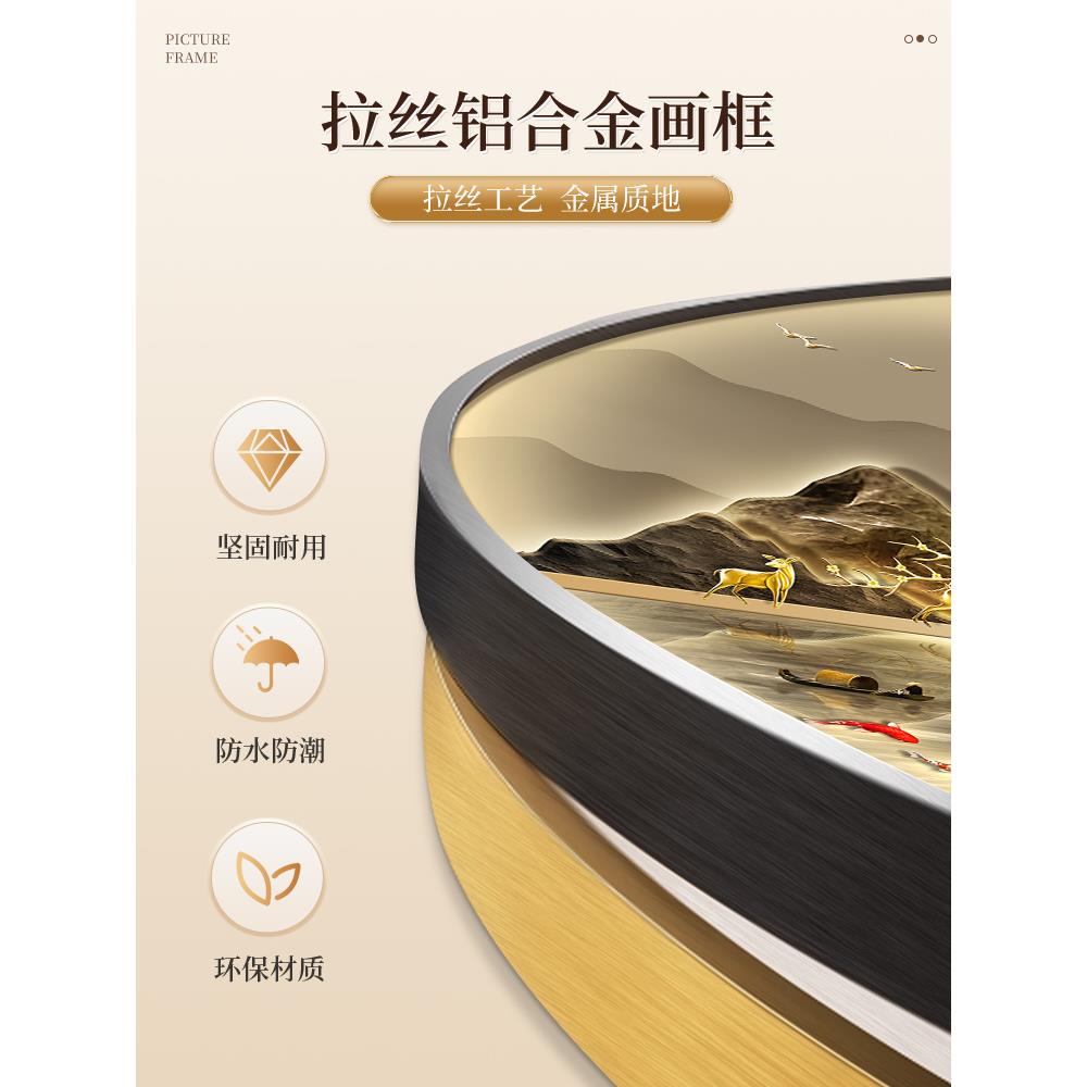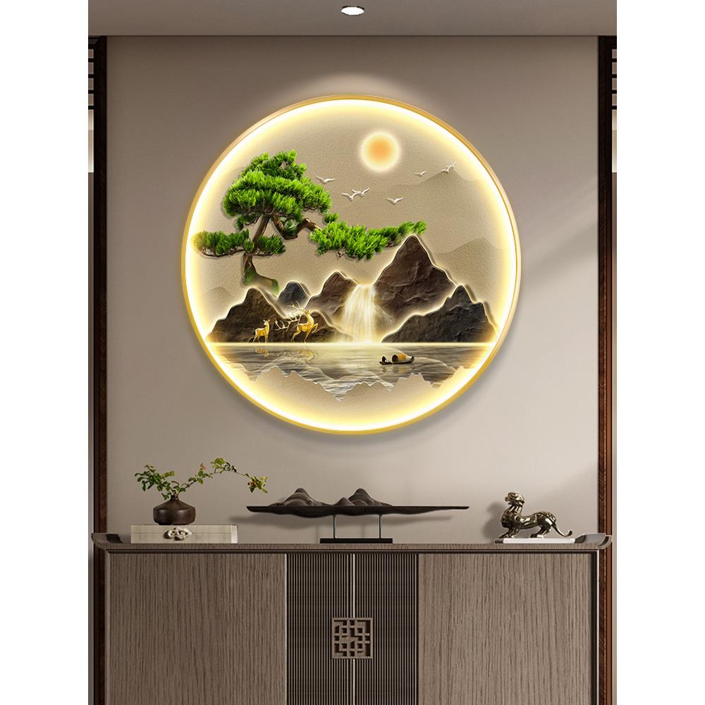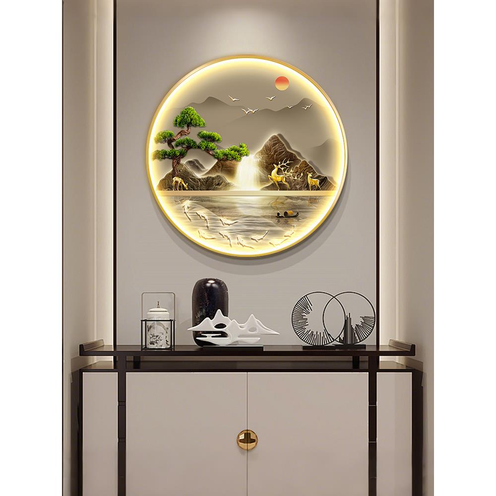 新中式入户圆形玄关装饰画走廊挂画流水生财高档山水带灯画九鱼图