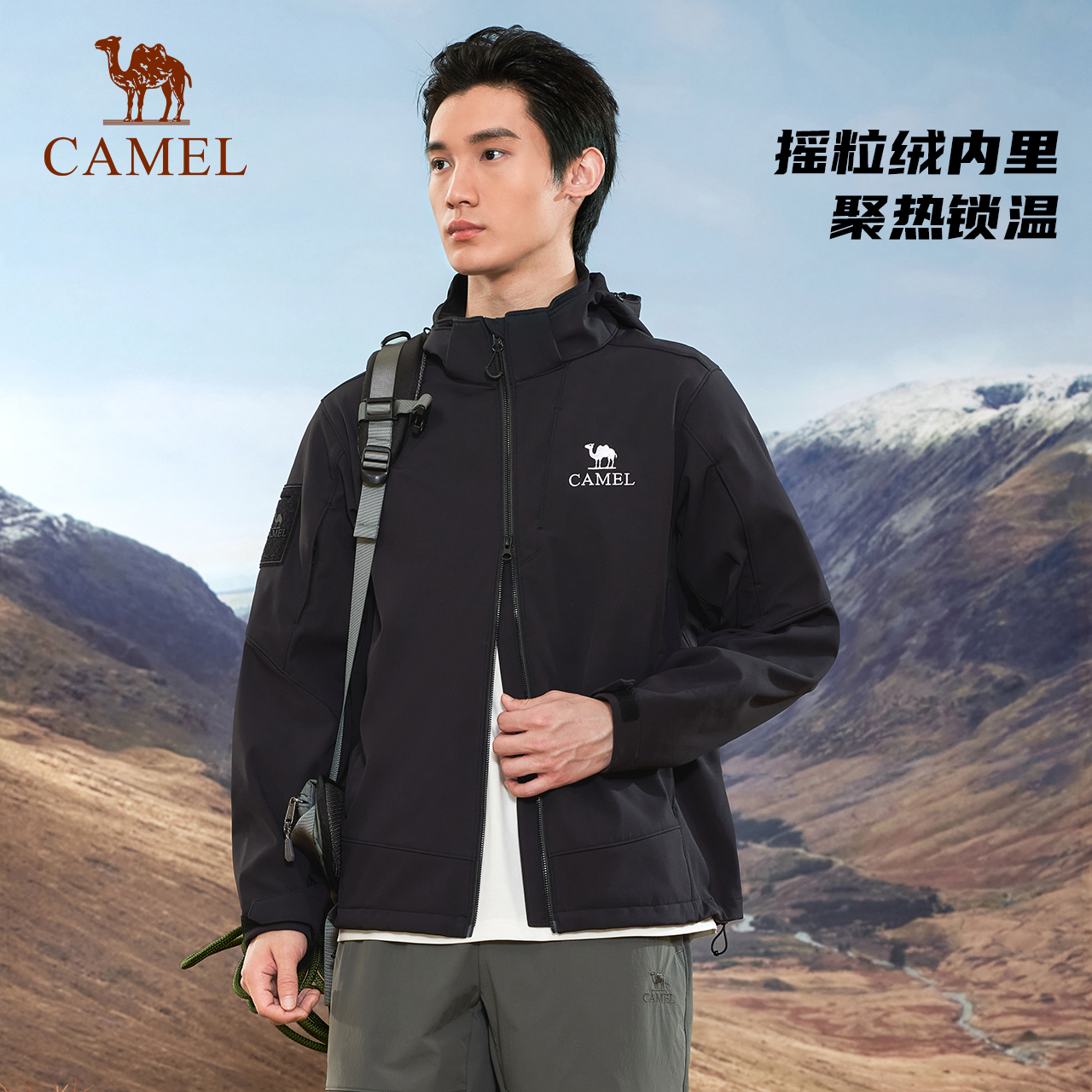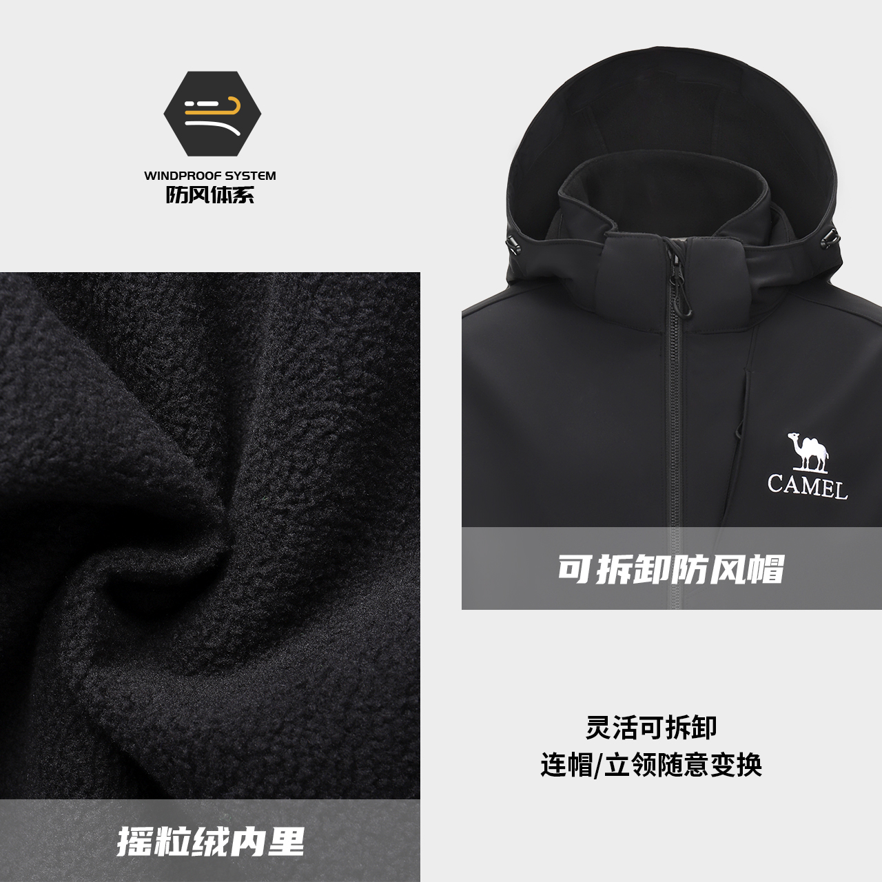 骆驼户外软壳衣男加绒保暖2025春秋新款防水防风夹克连帽抓绒外套