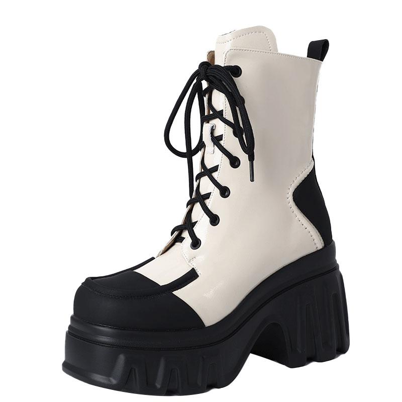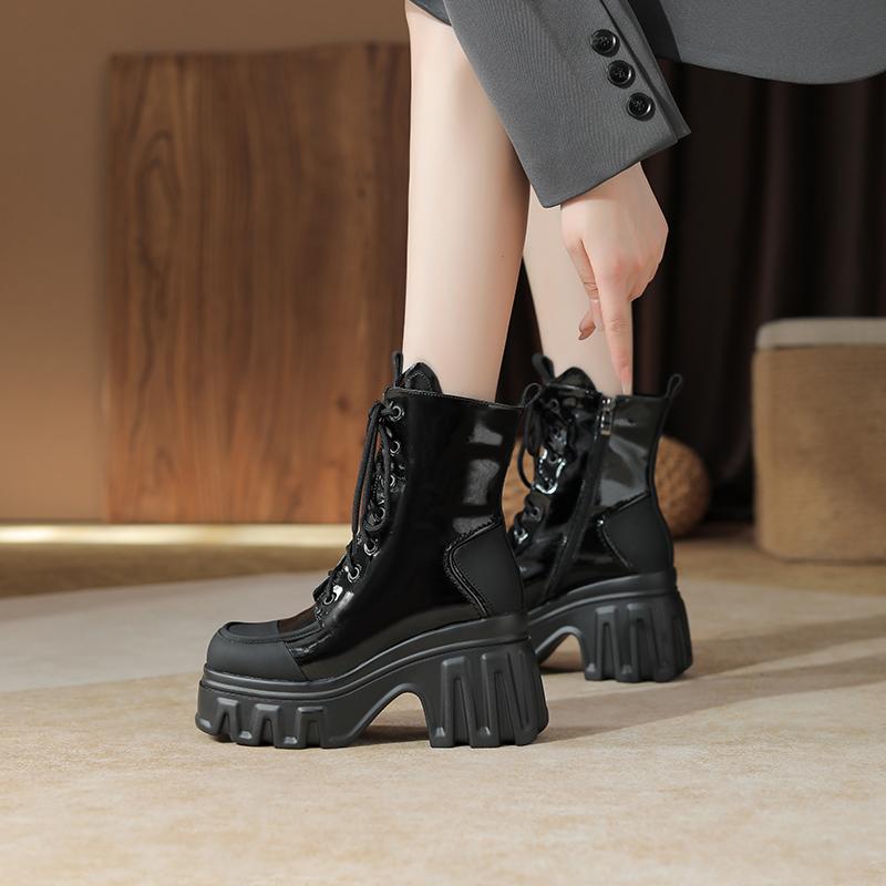 系带马丁靴女粗跟厚底小个子增高靴子秋冬英伦风10cm高跟骑士短靴