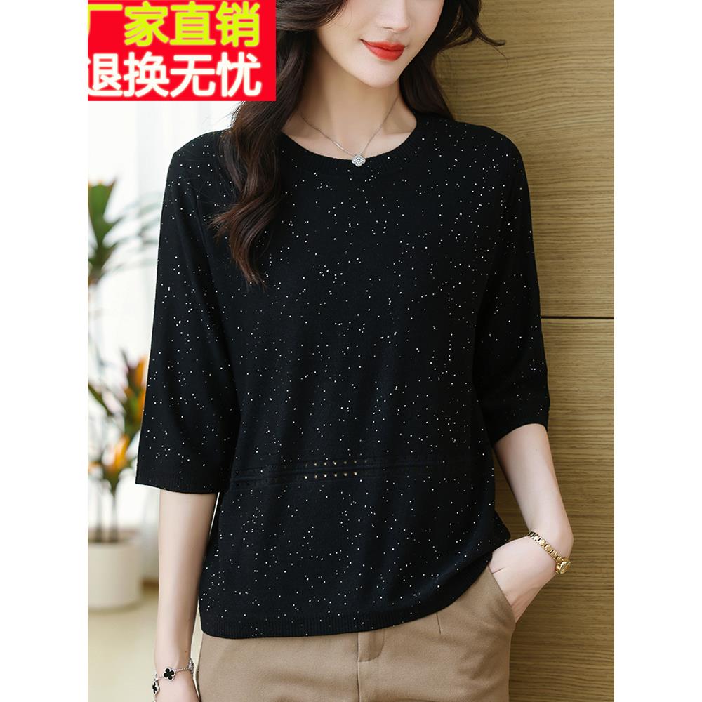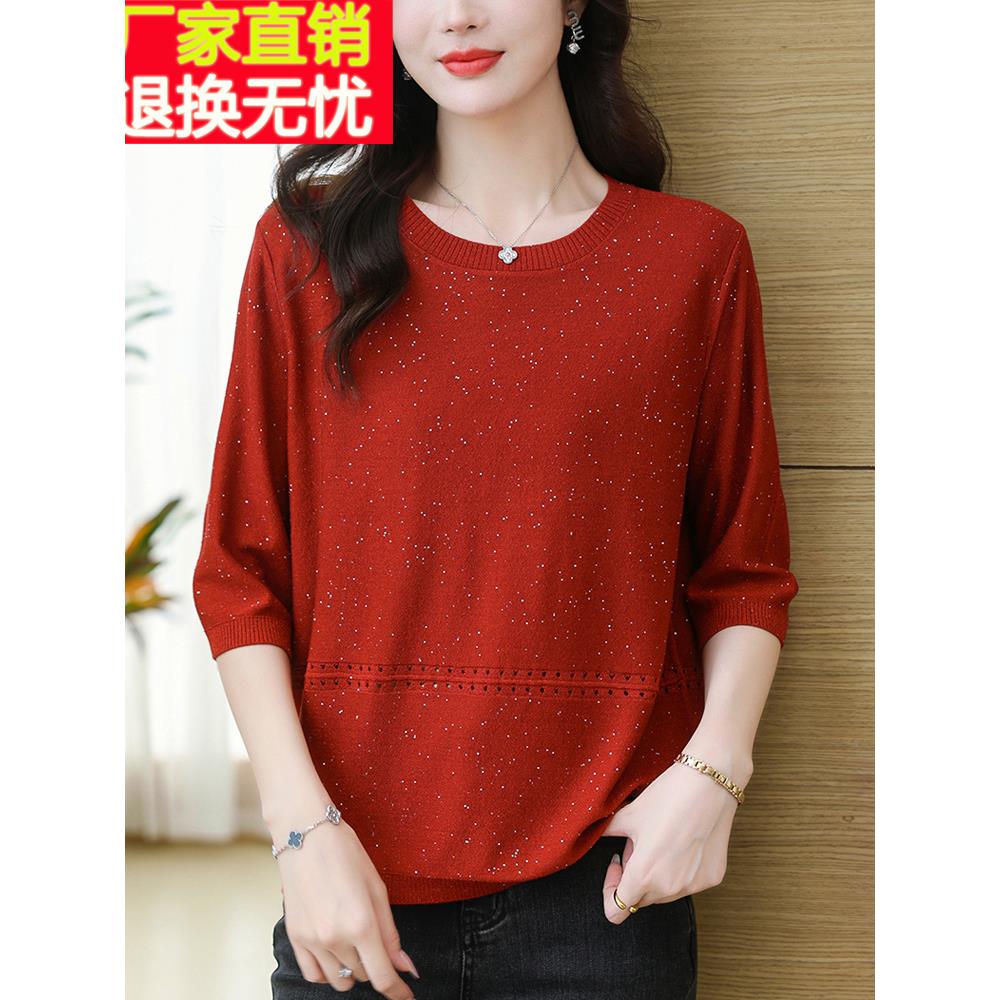 中年妈妈桑蚕丝t恤女中袖洋气上衣宽松大码七分袖春秋薄款针织衫