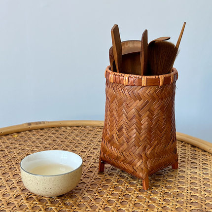 手工竹编茶道具田园风六君子笔筒