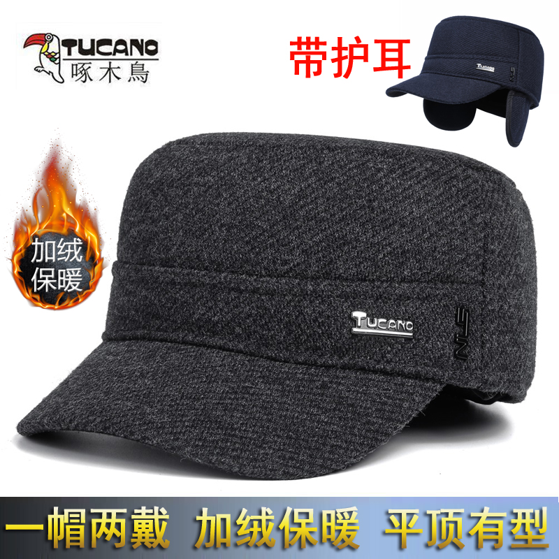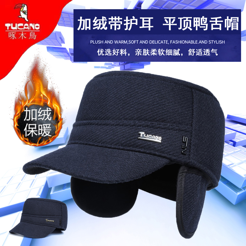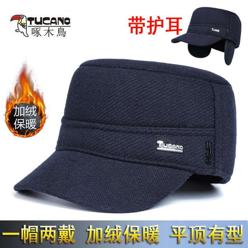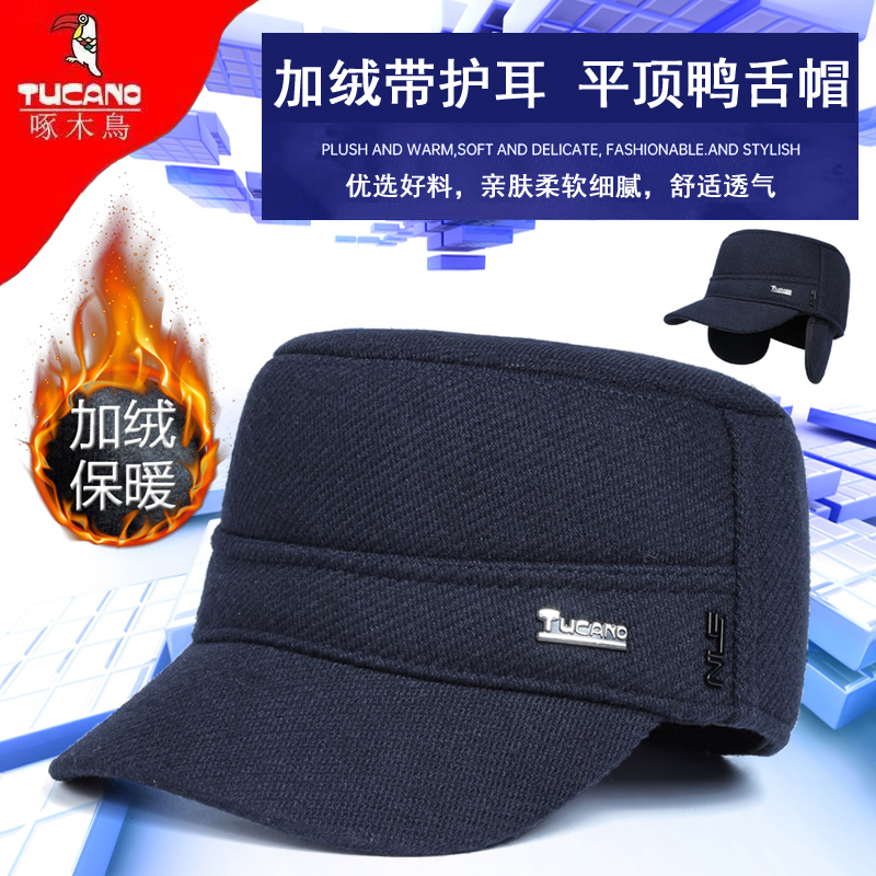啄木鸟男士加绒平顶帽户外休闲帽男中老年防寒带护耳鸭舌帽旅游帽