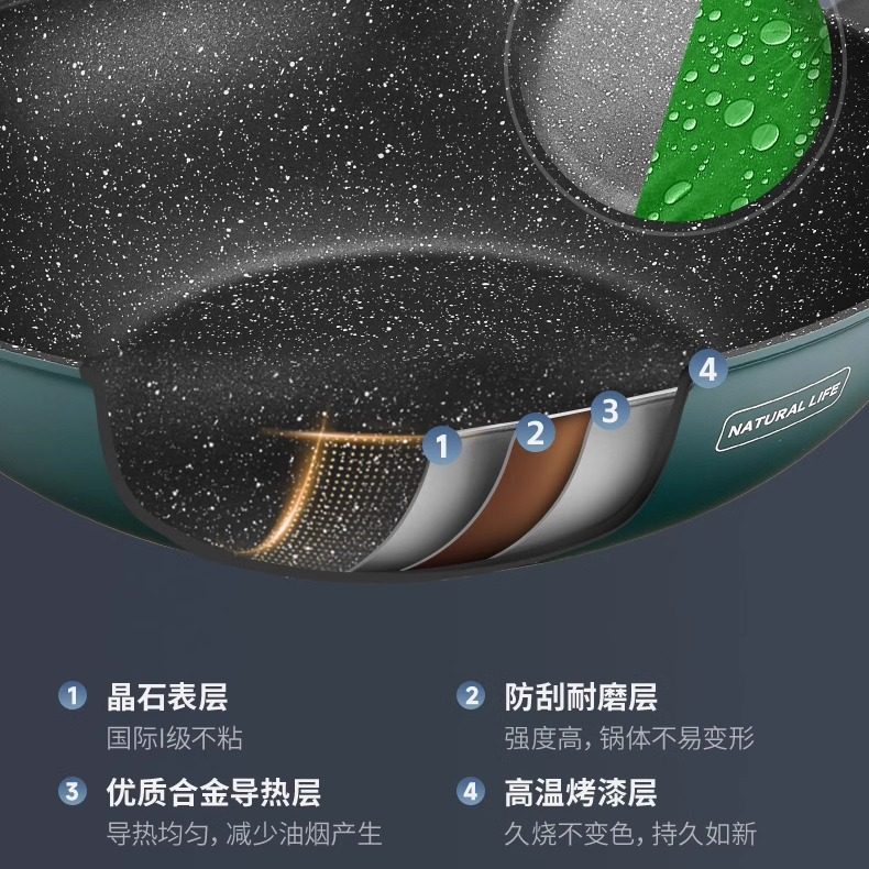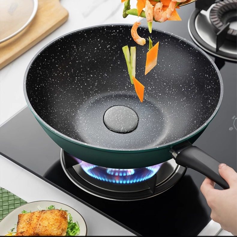 爱仕达炒锅不粘锅家用麦饭石色炒菜锅平底锅电磁炉燃气煤气灶适用