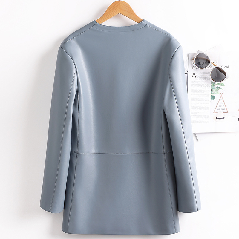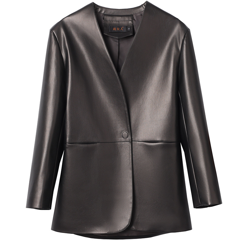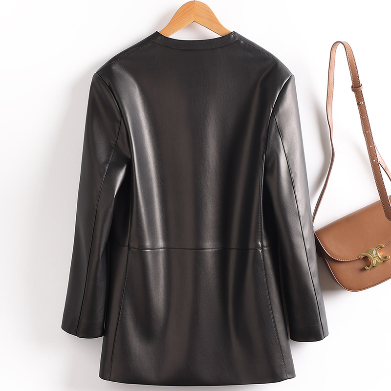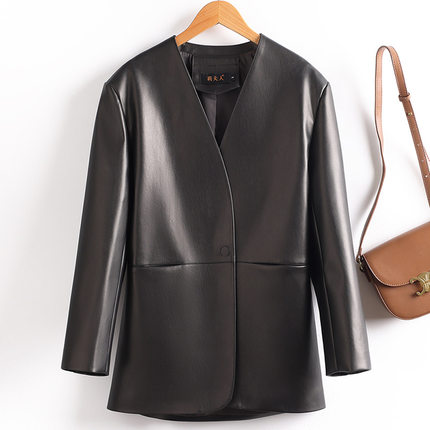新款真皮皮衣女中长款宽松显瘦V领小西装外套轻奢气质皮风衣高级