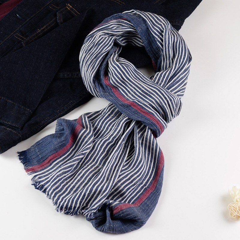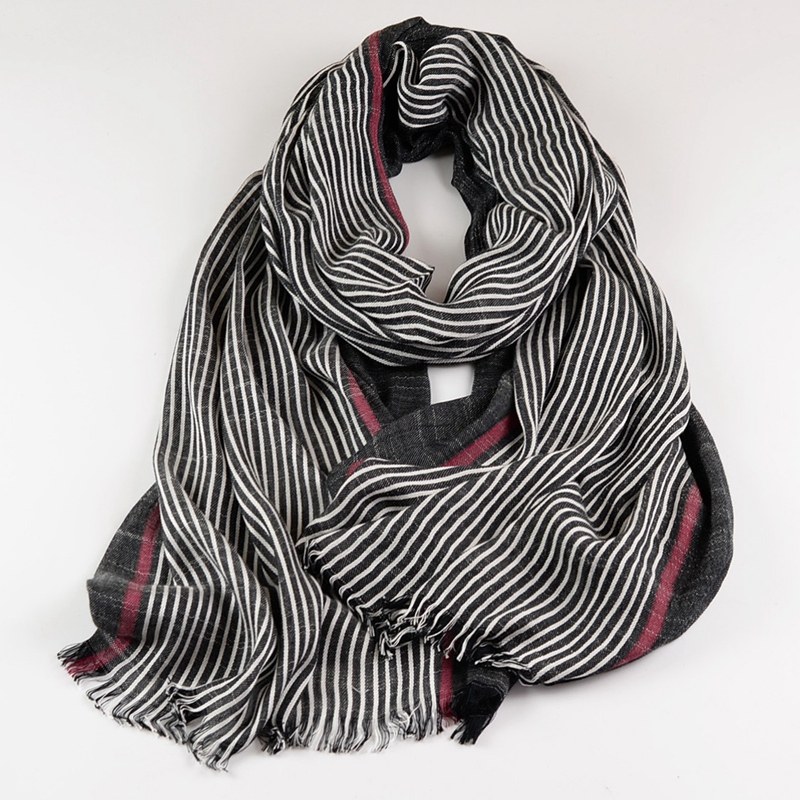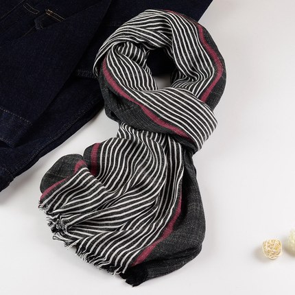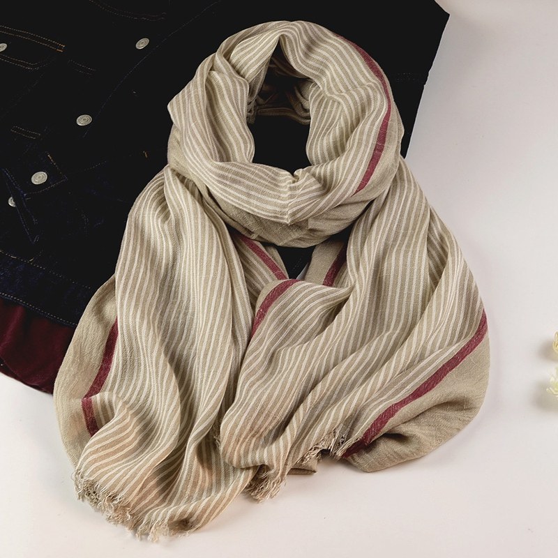 新款卡其色围巾男女春秋季薄款韩版黑色条纹简约百搭棉麻风青中年