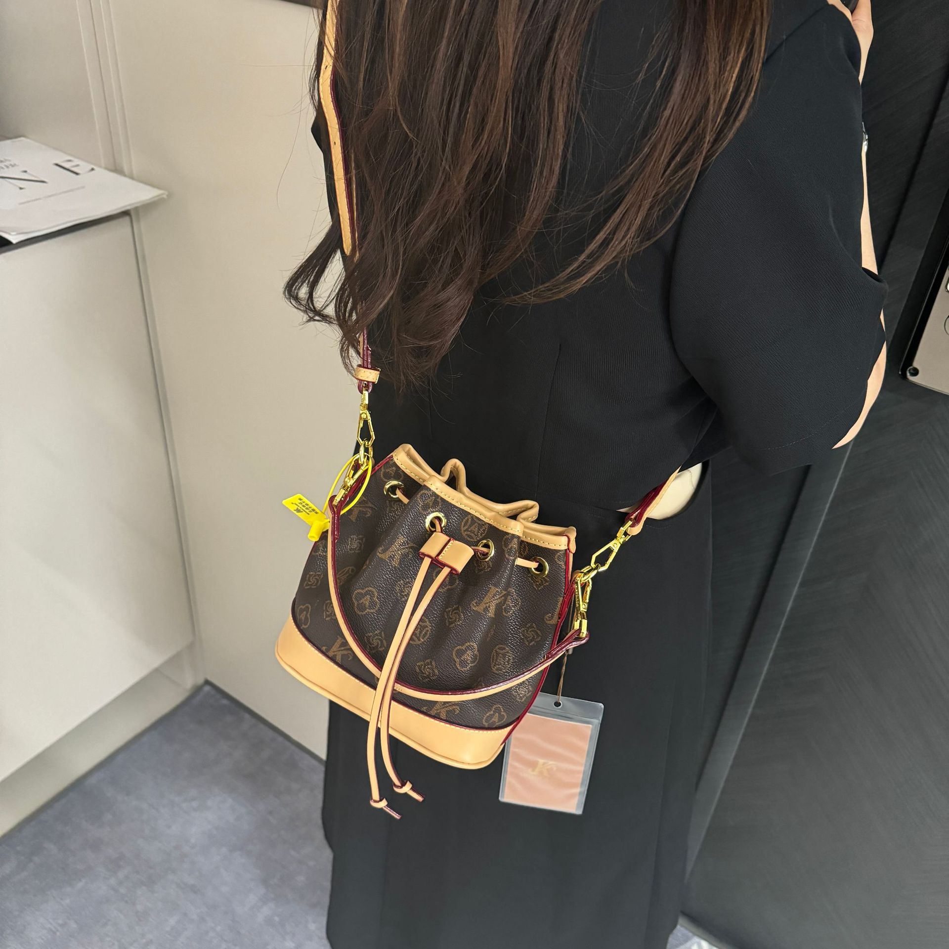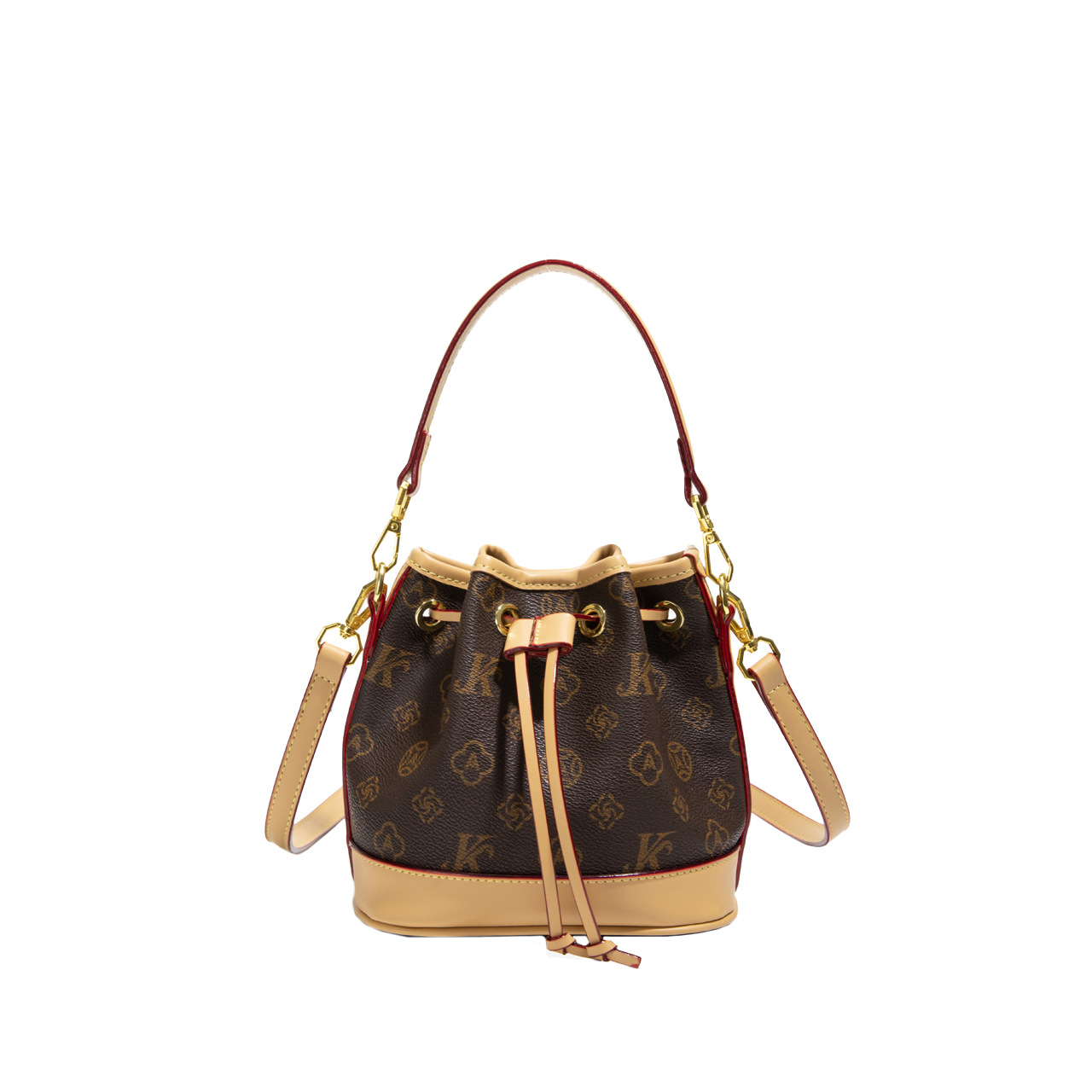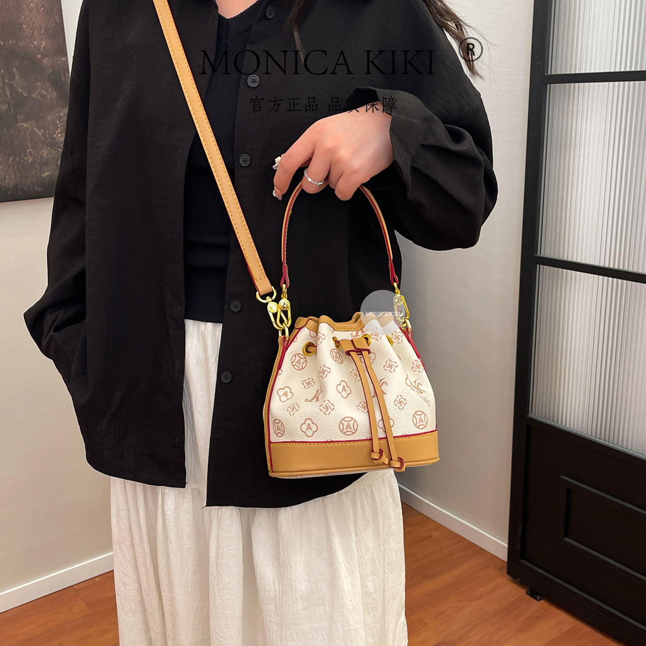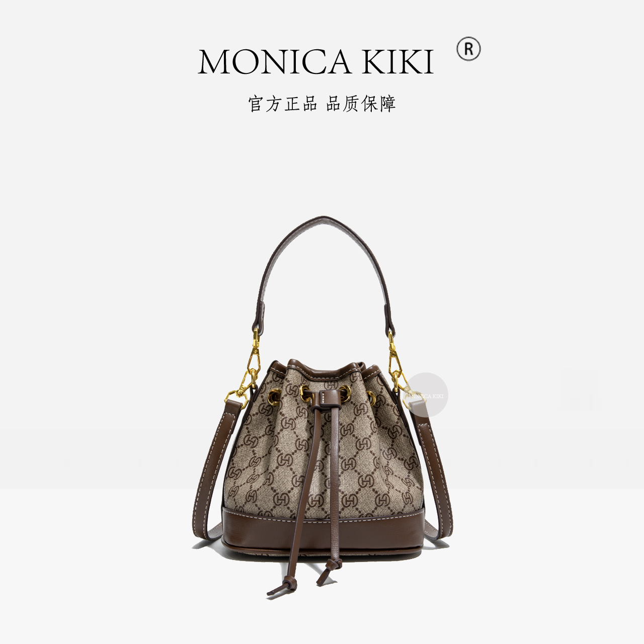 莫妮卡奇奇撞色轻奢老花抽带水桶包女感单肩斜挎大容量韩版潮