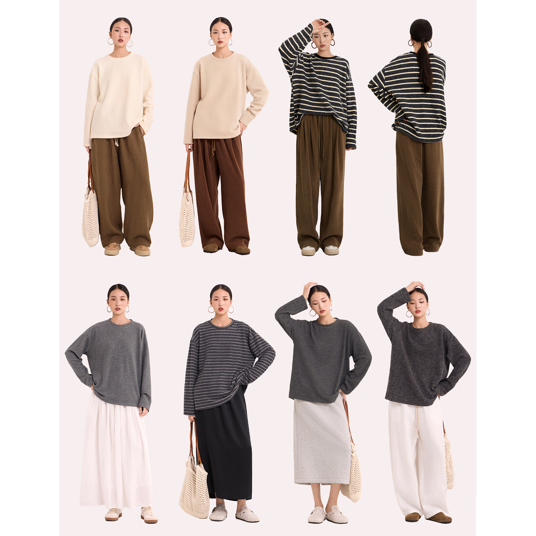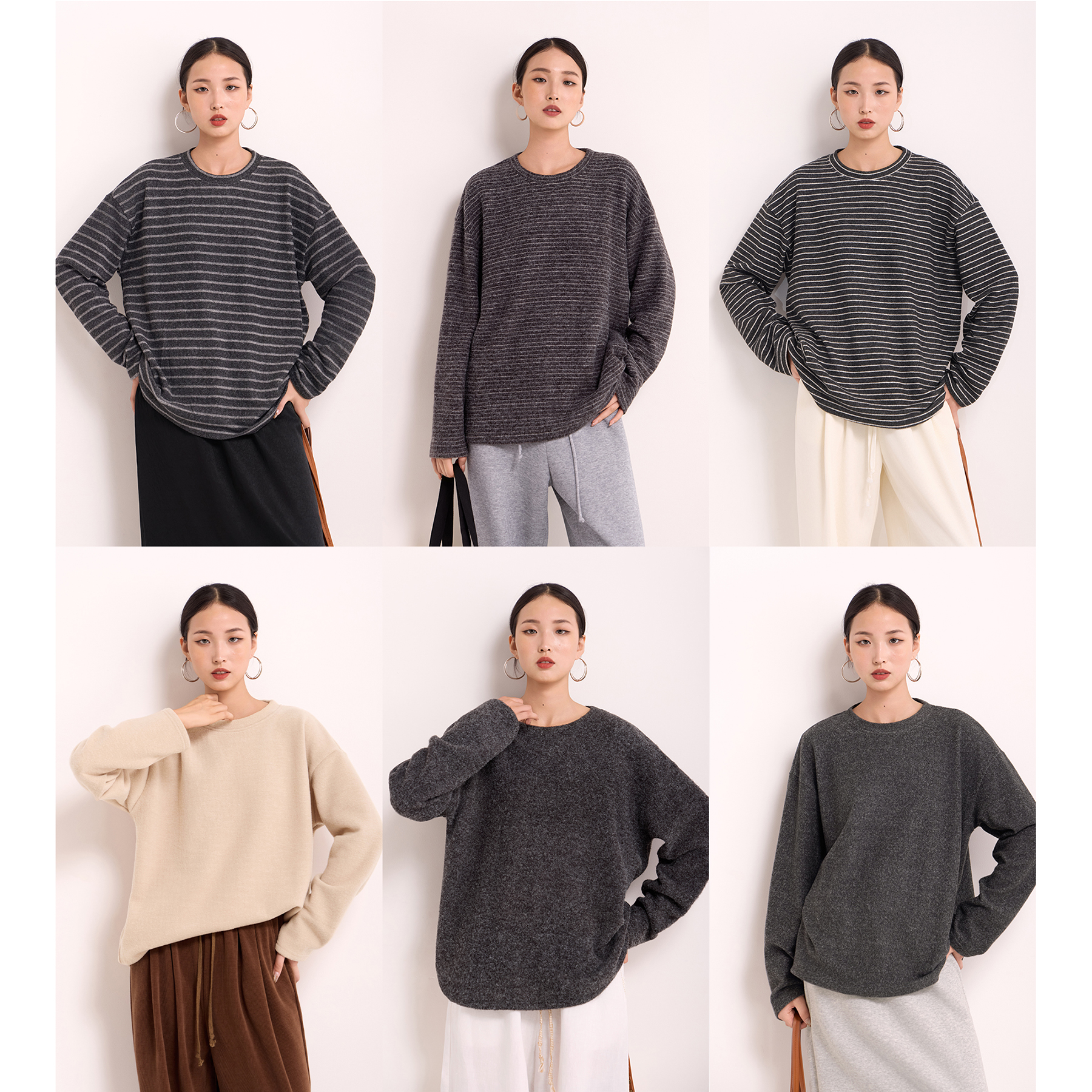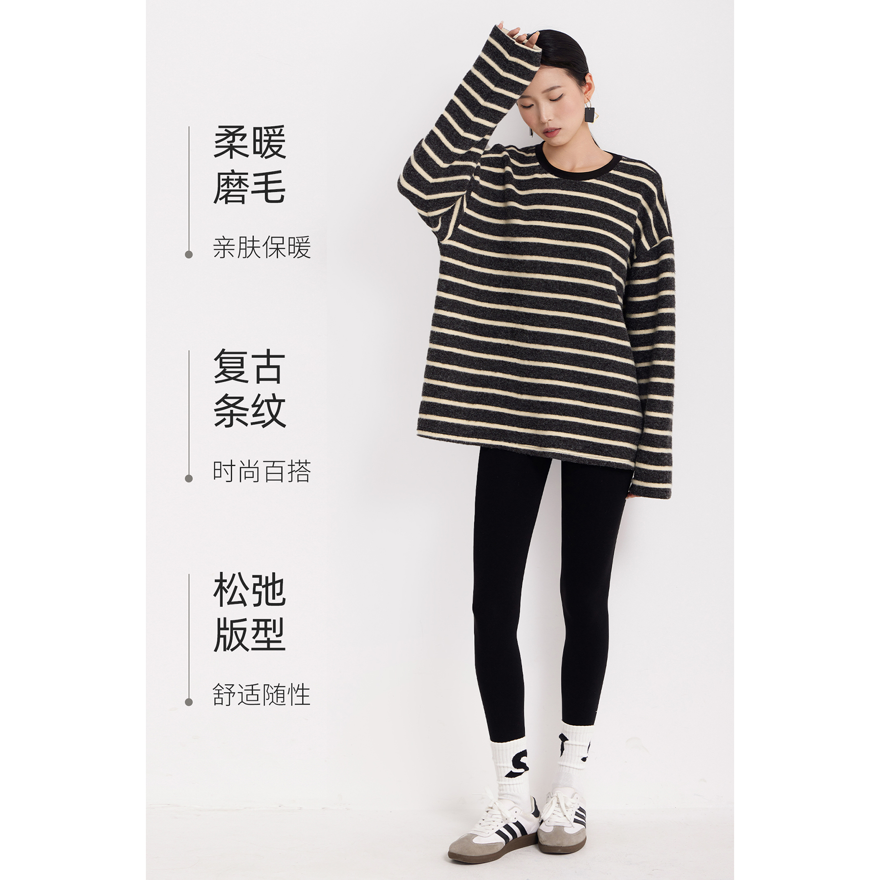 毛衣上衣针织打底衫罩衫双面磨毛绒条纹加厚女装春秋宽松百搭长袖