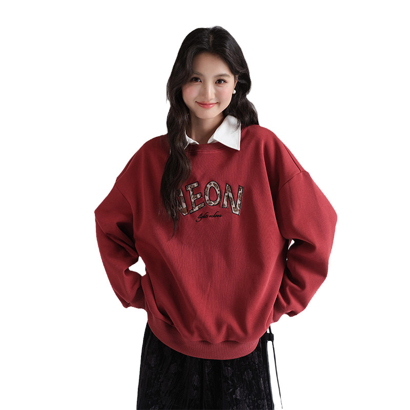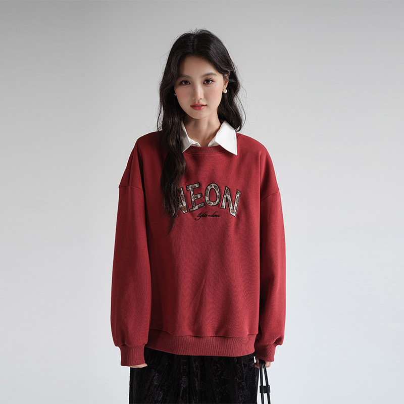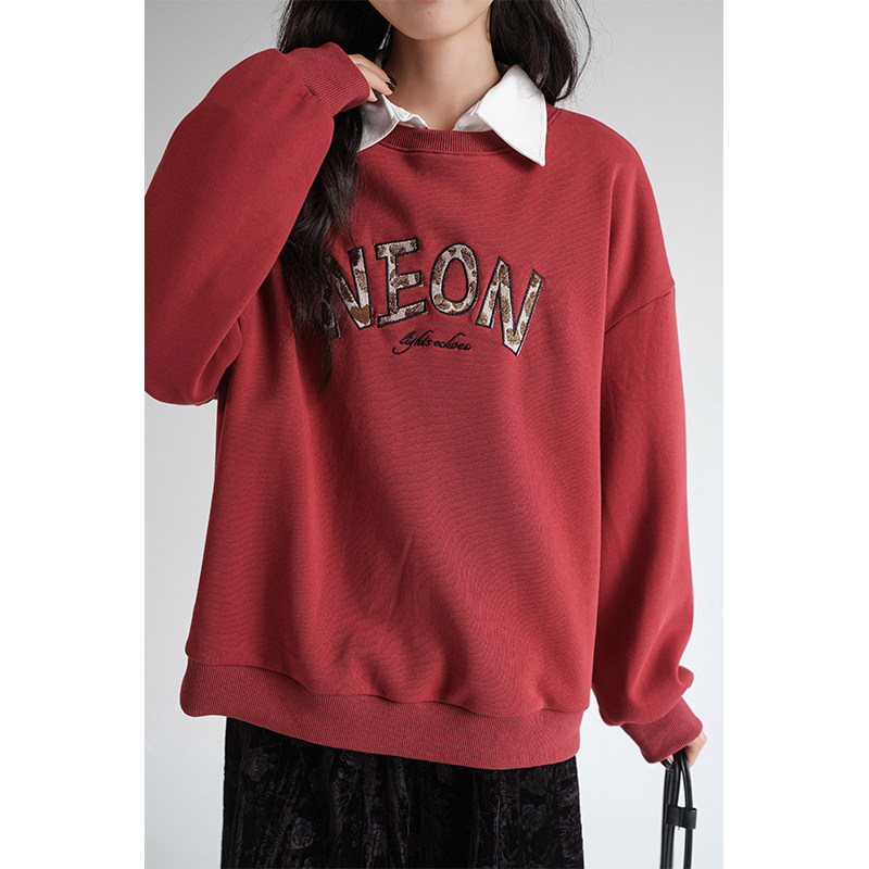 蓝若水大码女装字母绣花加绒保暖卫衣胖mm春装新款宽松藏肉上衣