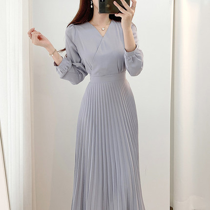 韩国chic秋季气质复古V领交叉高腰过膝中长款长袖雪纺百褶连衣裙