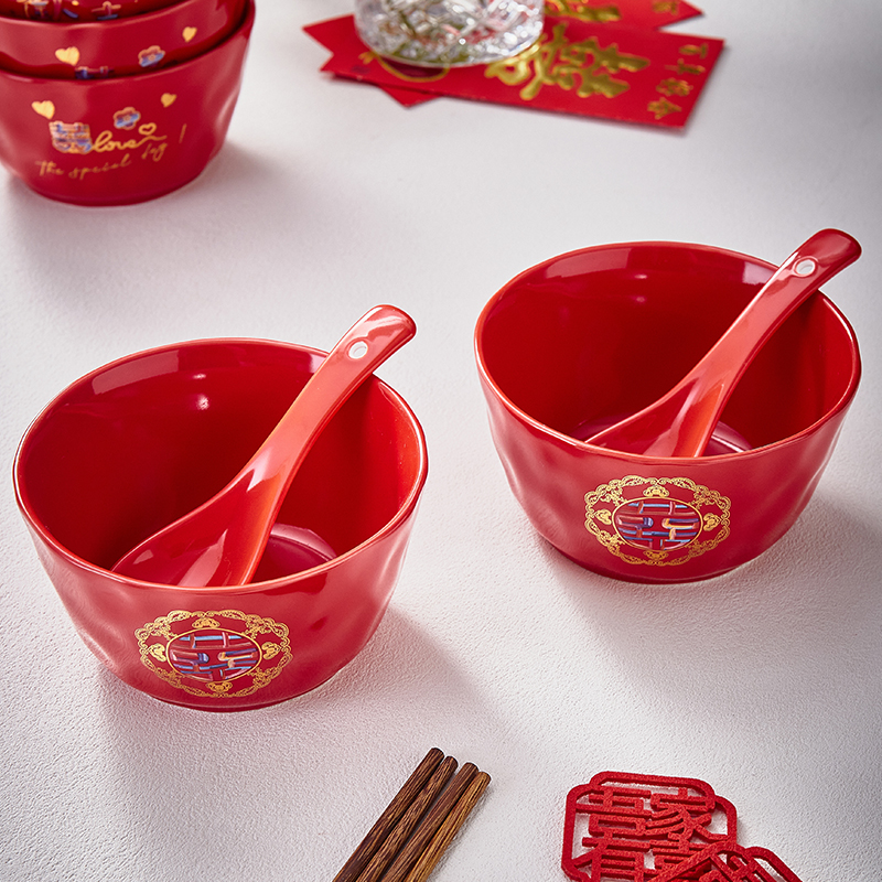 中式全红结婚喜碗喜庆家用陶瓷碗勺筷餐具套装婚庆回礼伴手礼筷子