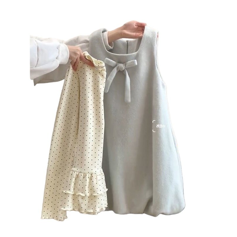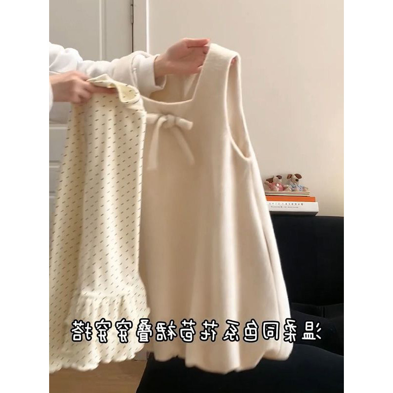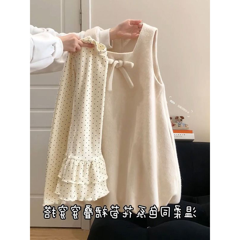 法式学院风穿搭一整套减龄蝴蝶结背心花苞裙女叠穿百搭波点打底衫