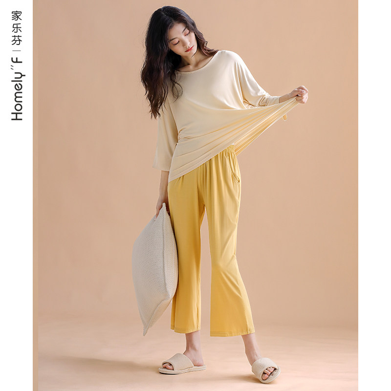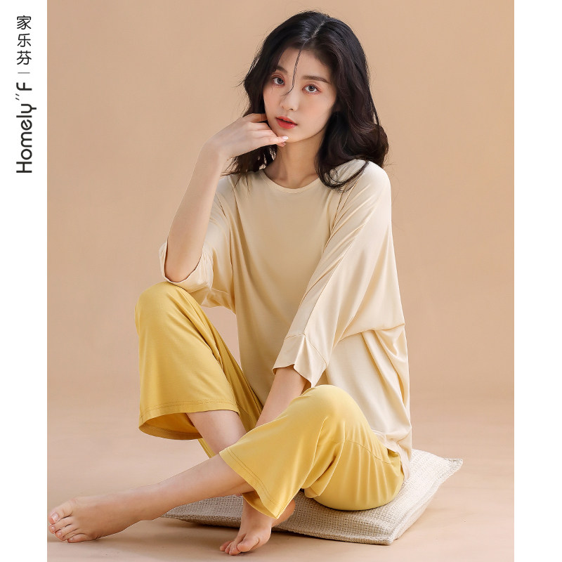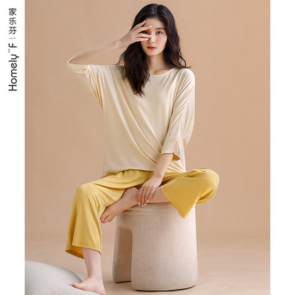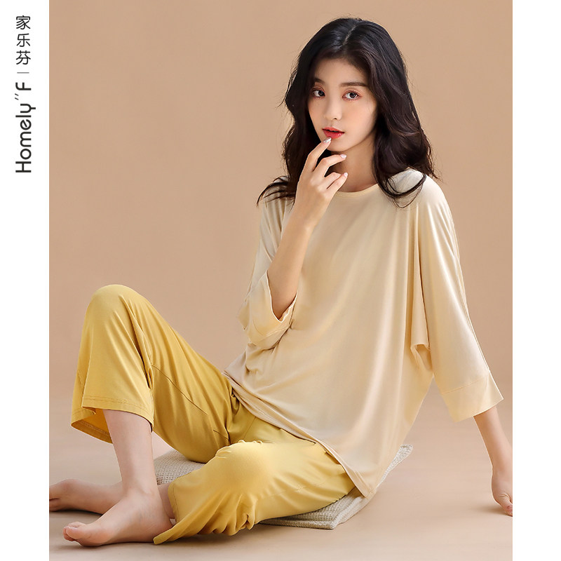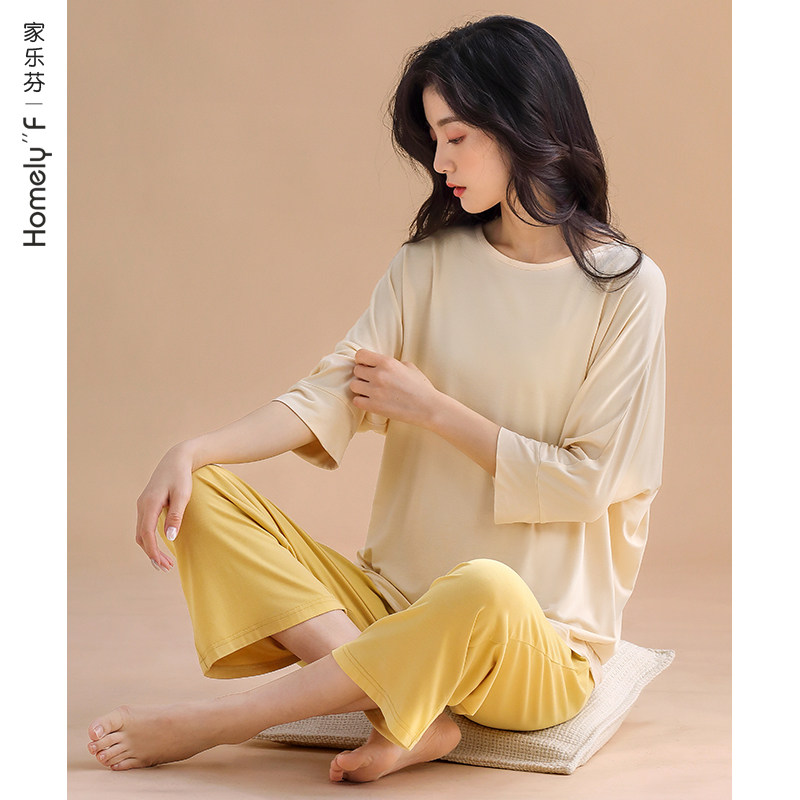 睡衣女士春秋季秋款春季七分袖长袖家居服夏莫代尔大码可外穿套装