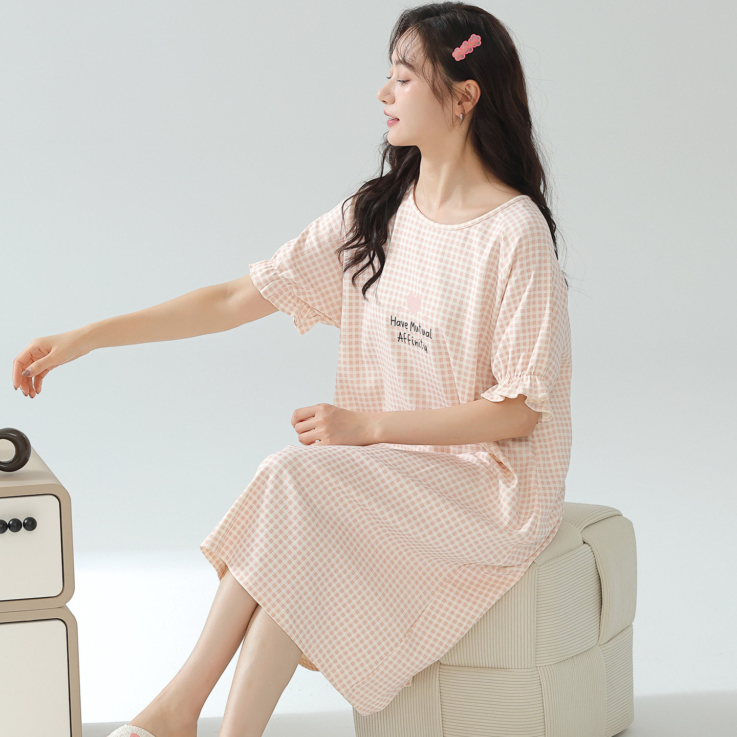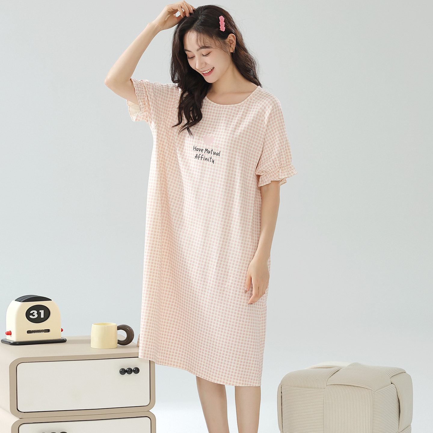 宜而爽夏天纯棉睡裙格子短袖中长款睡衣裙女休闲简约连衣裙可外穿