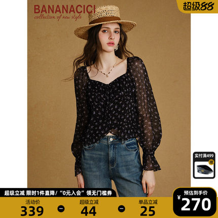 BANANA CICI2025年秋季新款复古法式浪漫小碎花雪纺长袖衬衫上衣