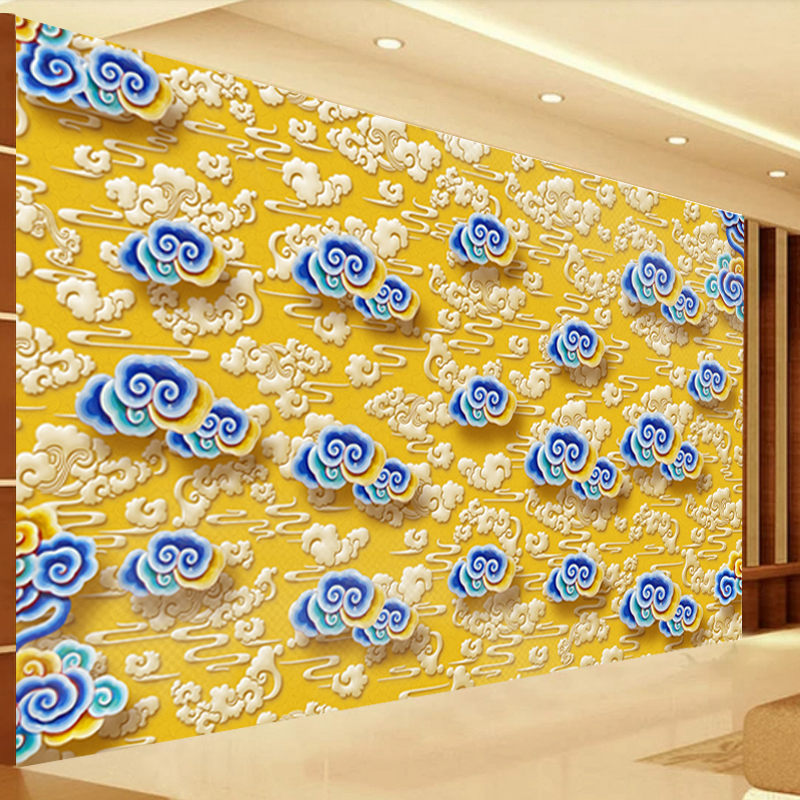 中式七彩祥云浮雕背景墙纸