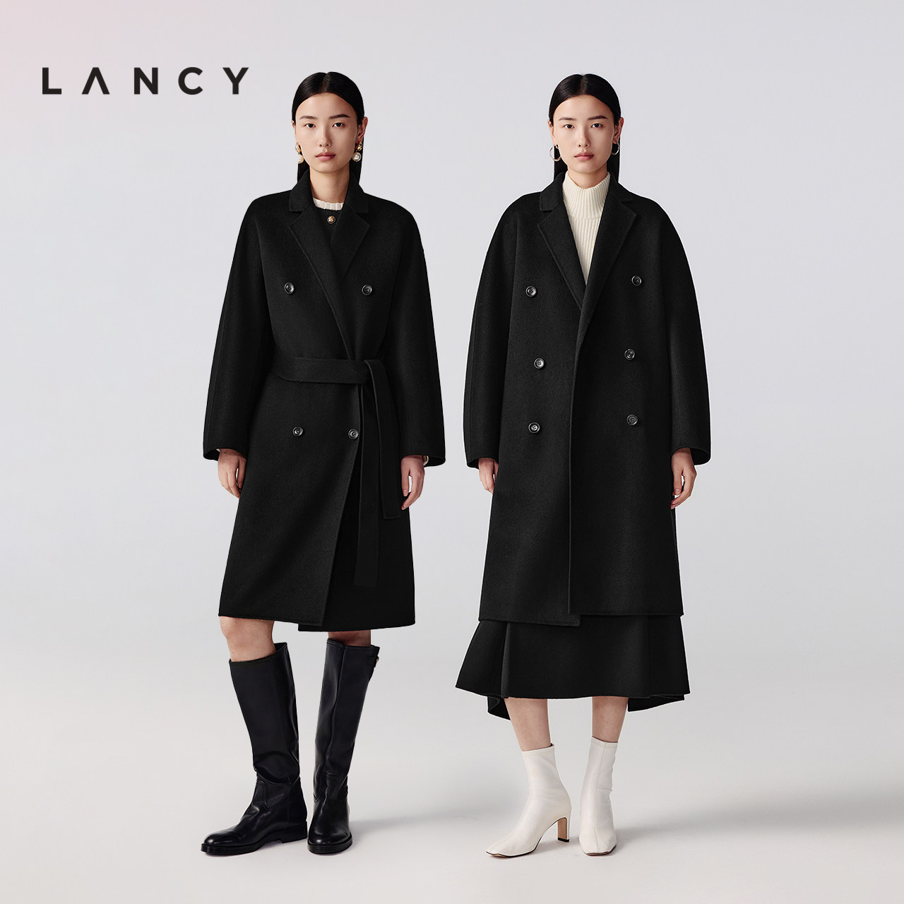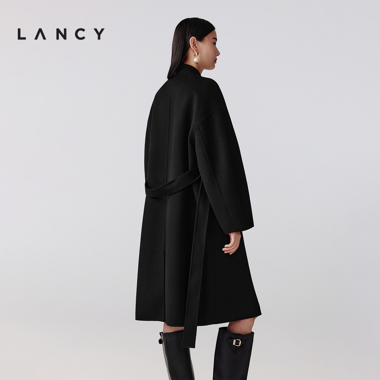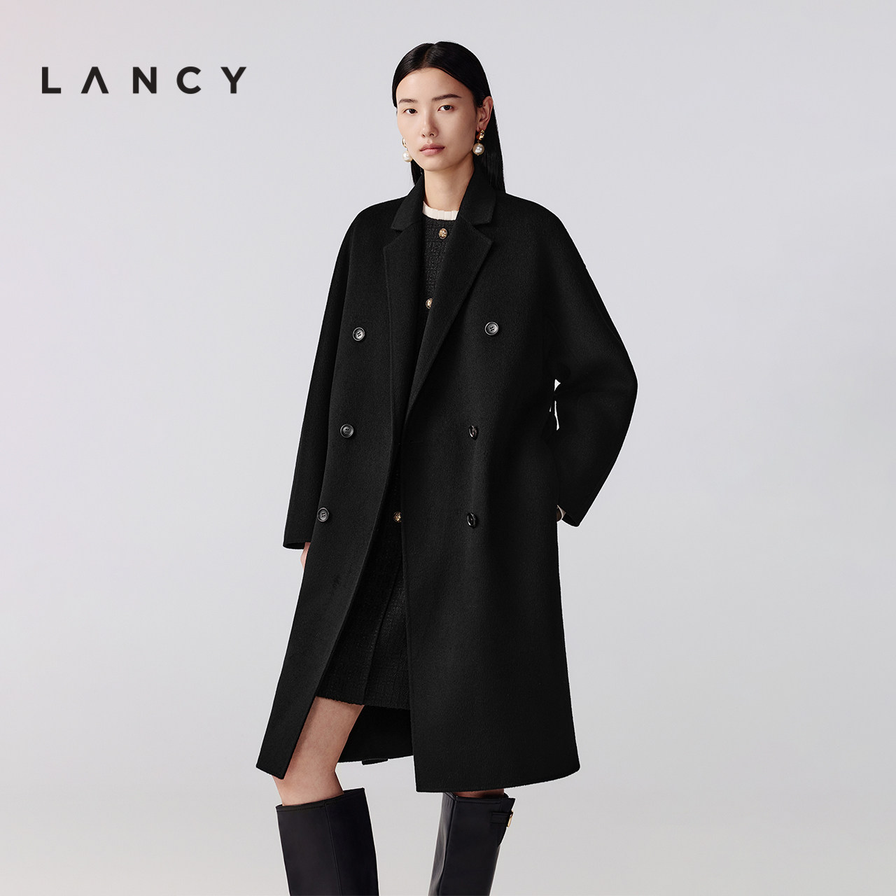 【100%羊毛】LANCY/朗姿2025冬新款双面呢长款大衣黑色毛呢外套女