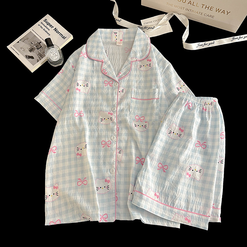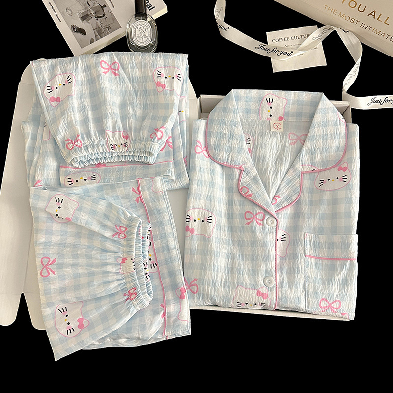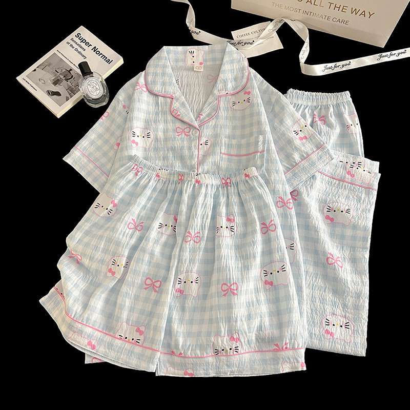 格子KT猫睡衣女款夏季短袖长裤三件套装云朵棉可爱卡通夏天家居服