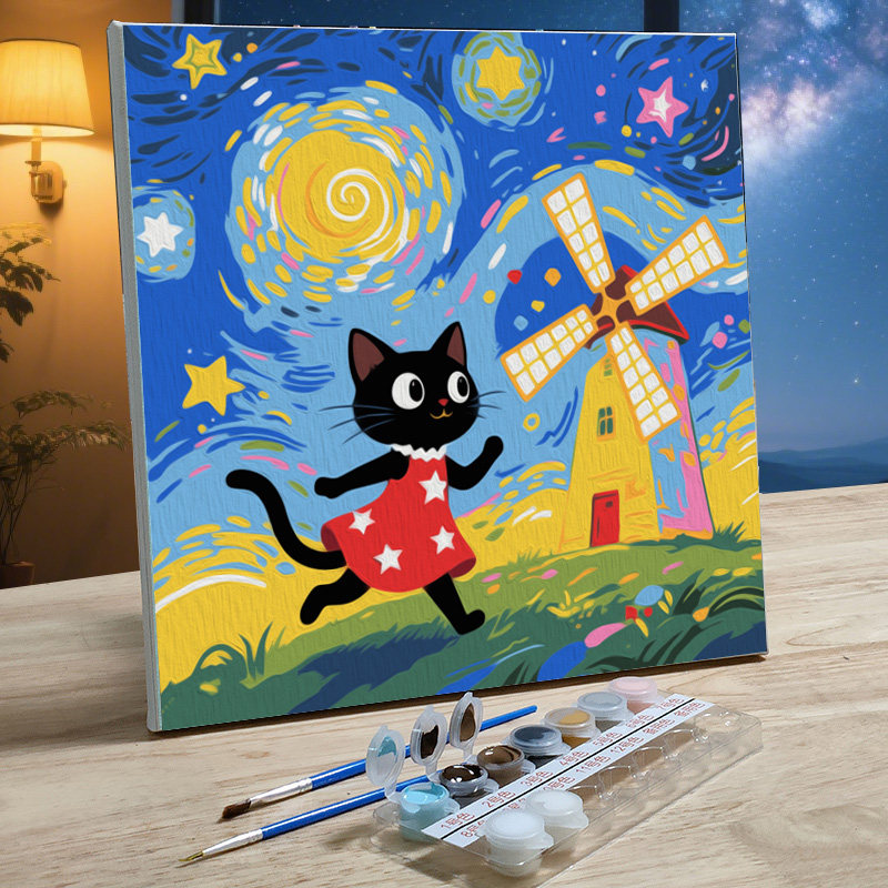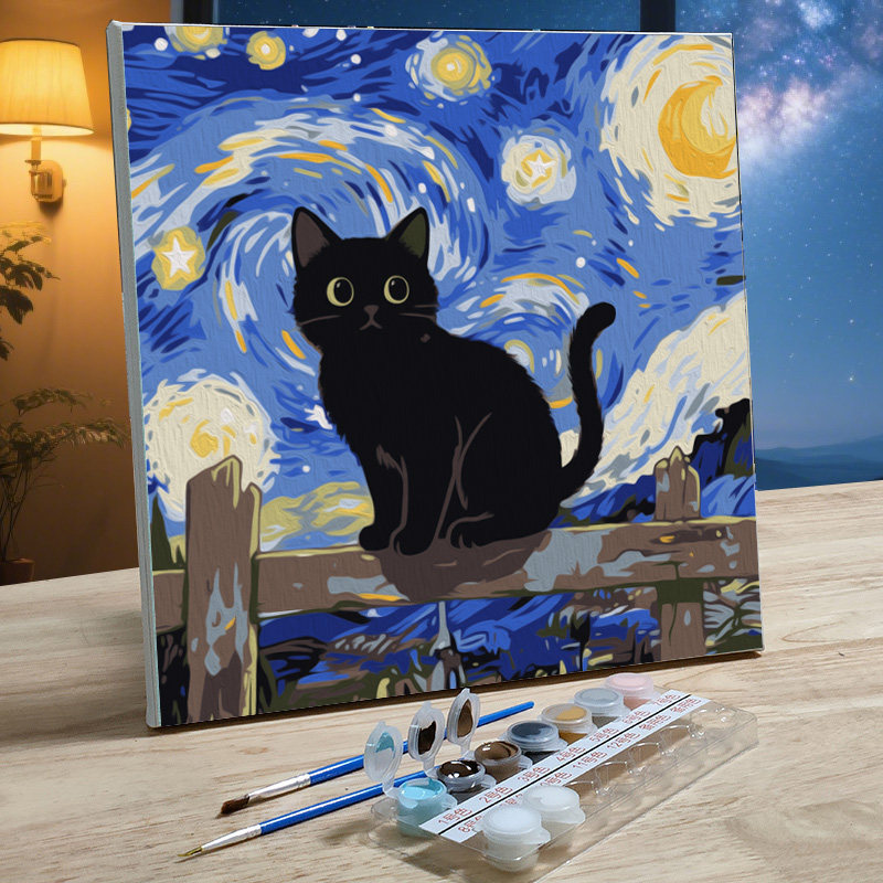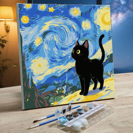 儿童手绘油画diy填色画数字油画简单填充油彩装饰画星空下的猫咪