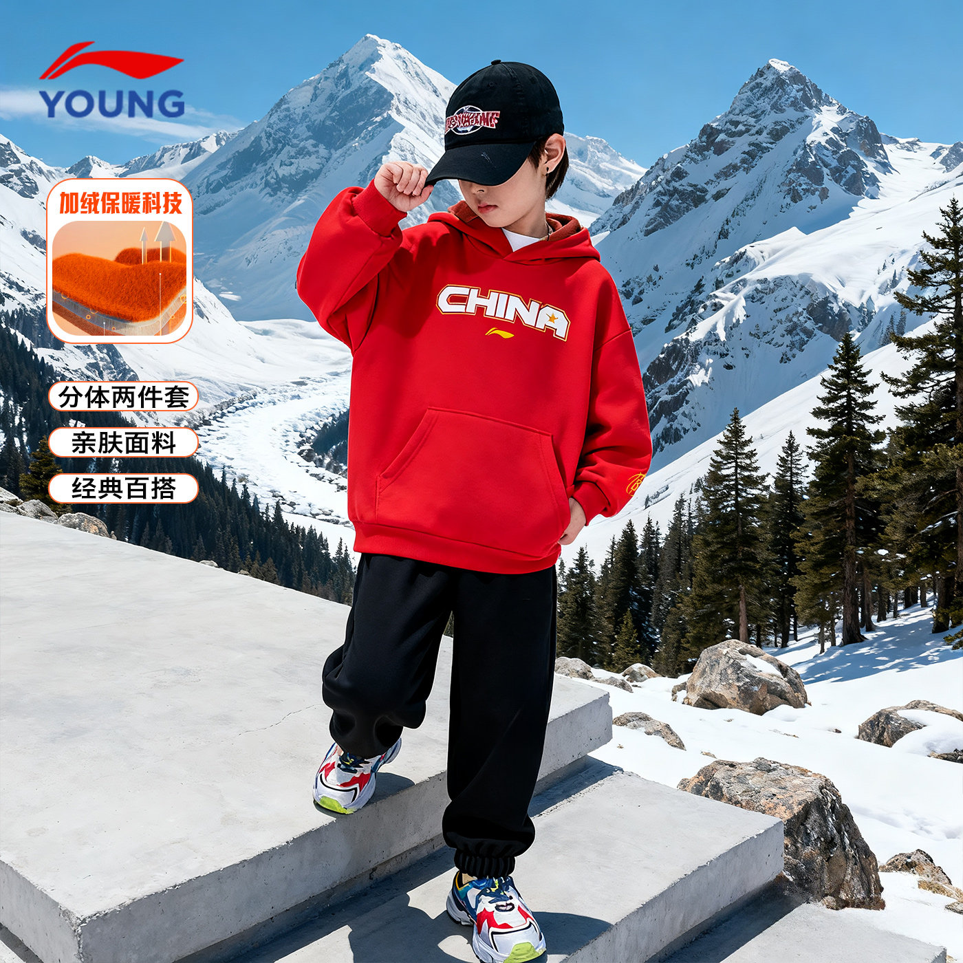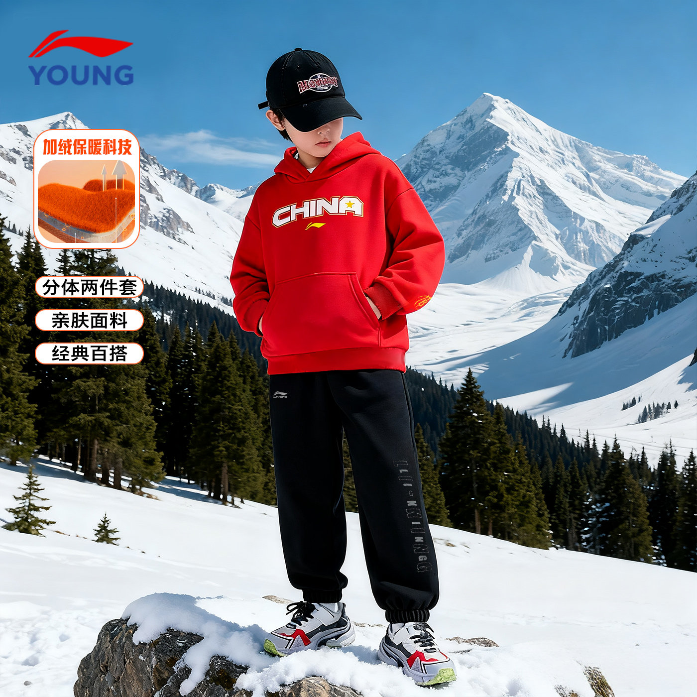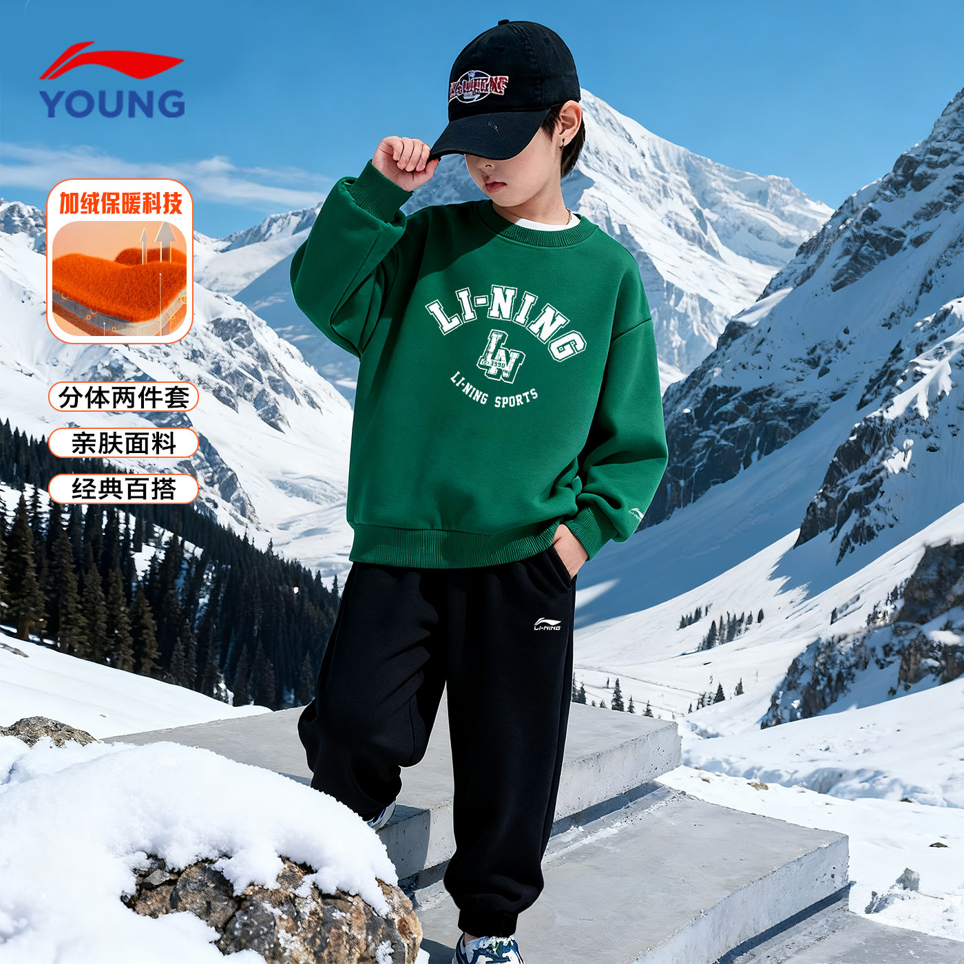 李宁儿童加绒套装男童卫衣裤子两件套2025新款男女大童秋冬运动服