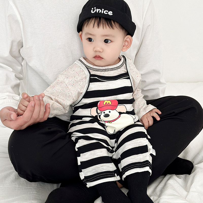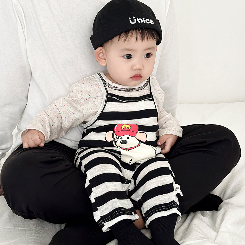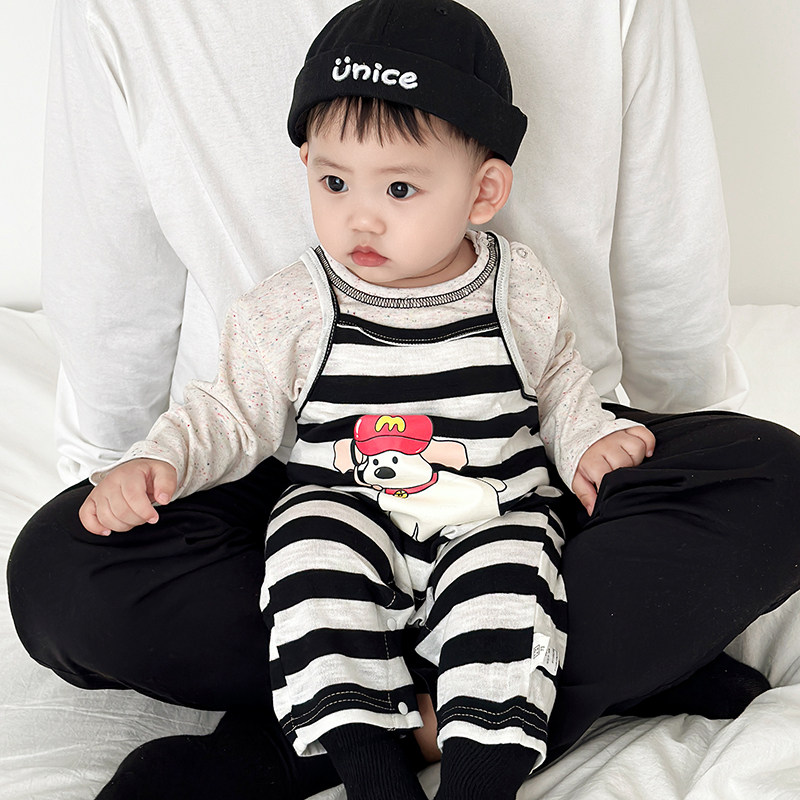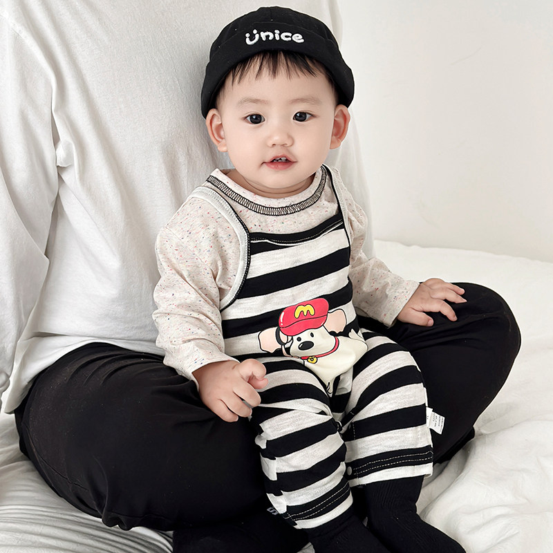男童春秋套装女宝宝条纹背心连体背带裤婴儿吊带爬服卡通长袖T恤
