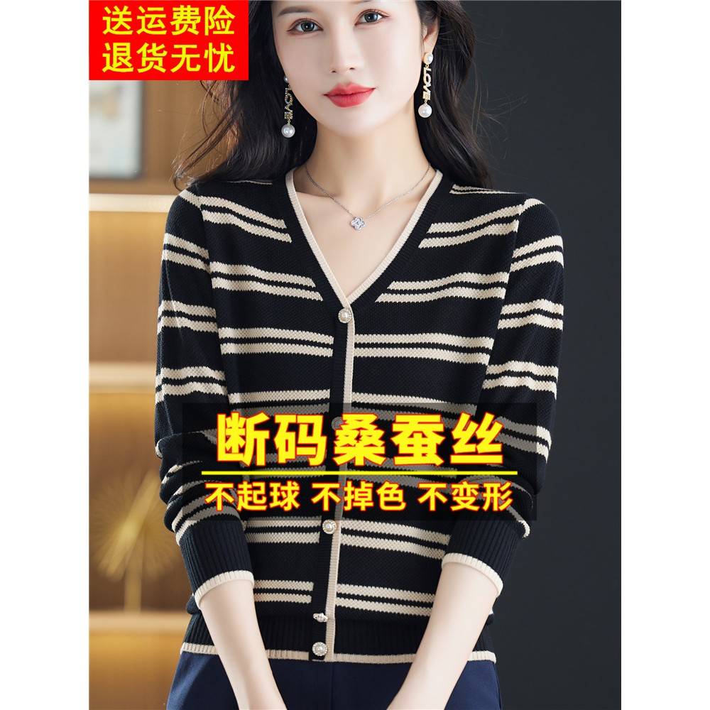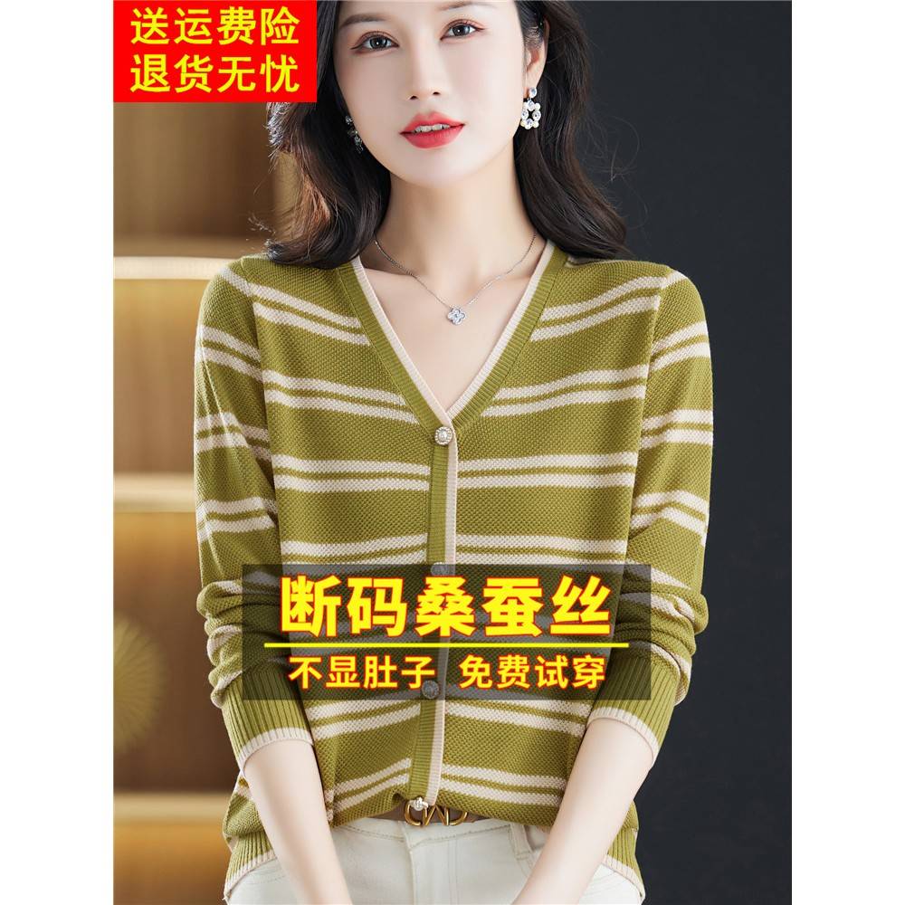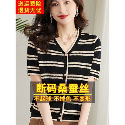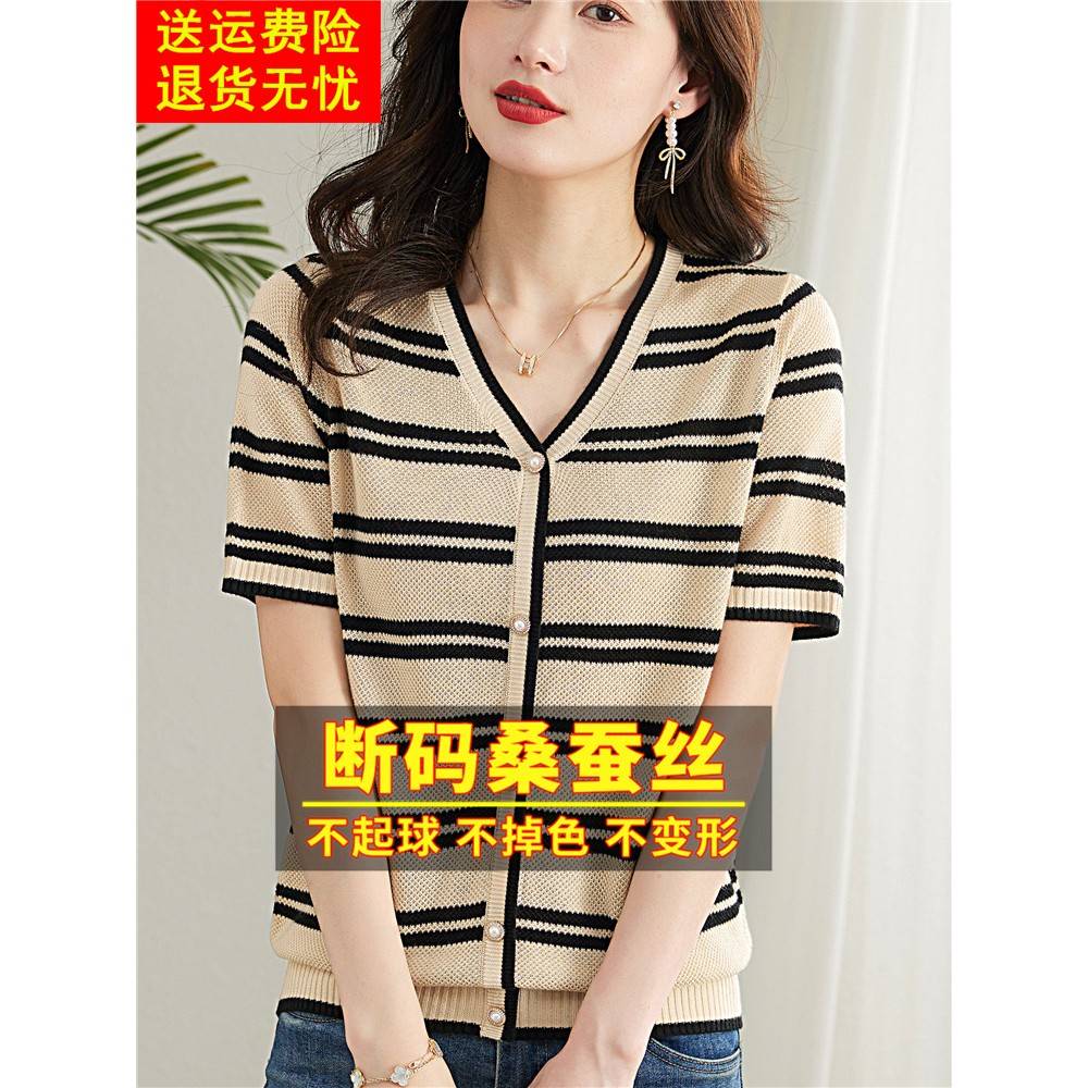 妈妈夏装针织桑蚕丝T恤女长袖V领短袖体恤大码条纹真丝上衣小衫薄