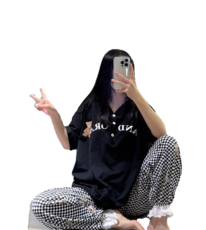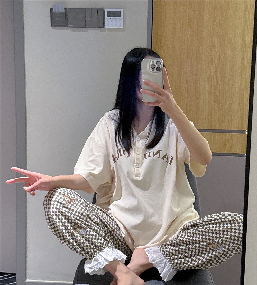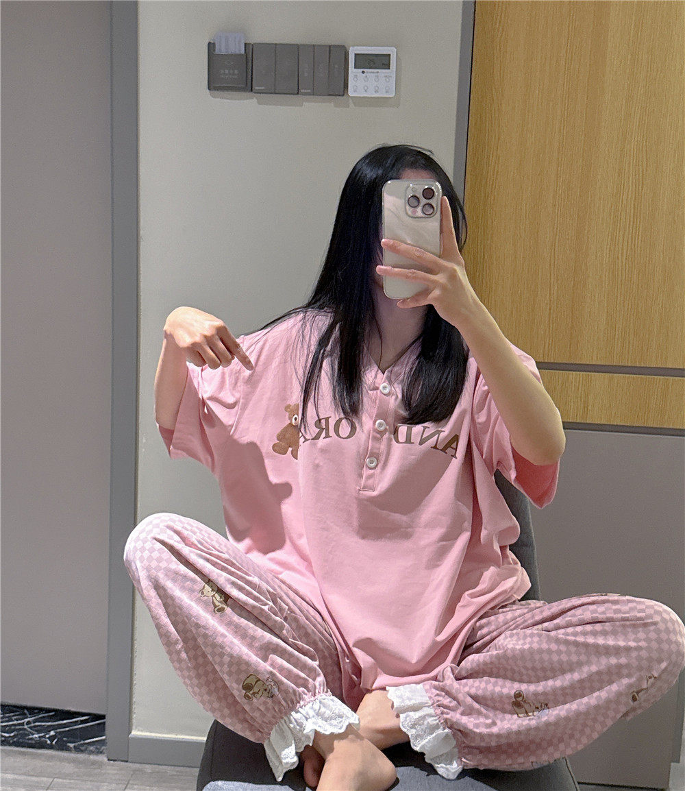 短袖睡衣女春夏V领纯棉小熊家居服大码胖mm200斤花边格子长裤套装