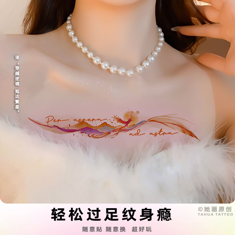 她画 凤凰拉丁文彩色纹身贴国风高级感防水持久女手臂臂环英文