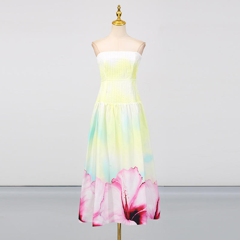 新款法式潮流性感抹胸裙夏季时尚花朵印花百褶修身无袖连衣裙高腰