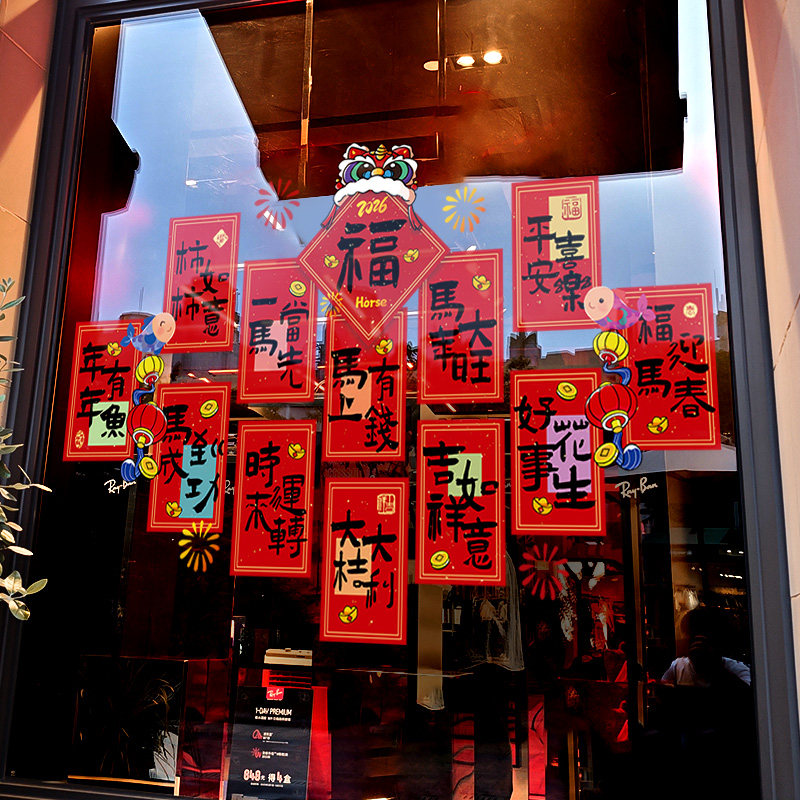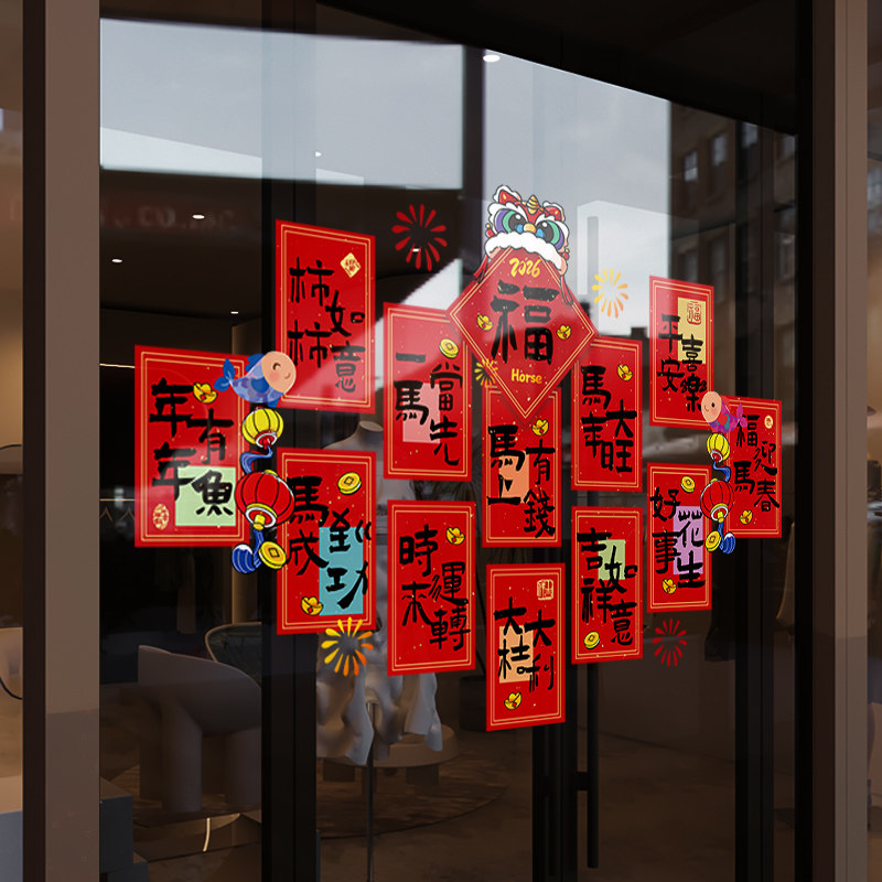 新年装饰窗花2026春节福字红包窗贴马年店铺橱窗静电玻璃贴门贴纸