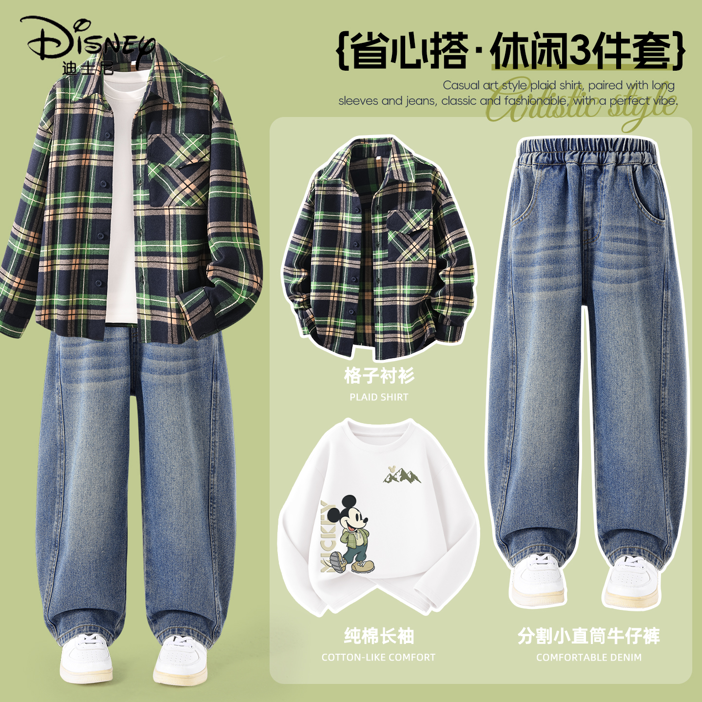 迪士尼男童套装春秋款2025新款童装长袖外套牛仔裤三件装儿童秋装