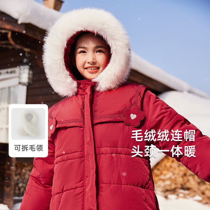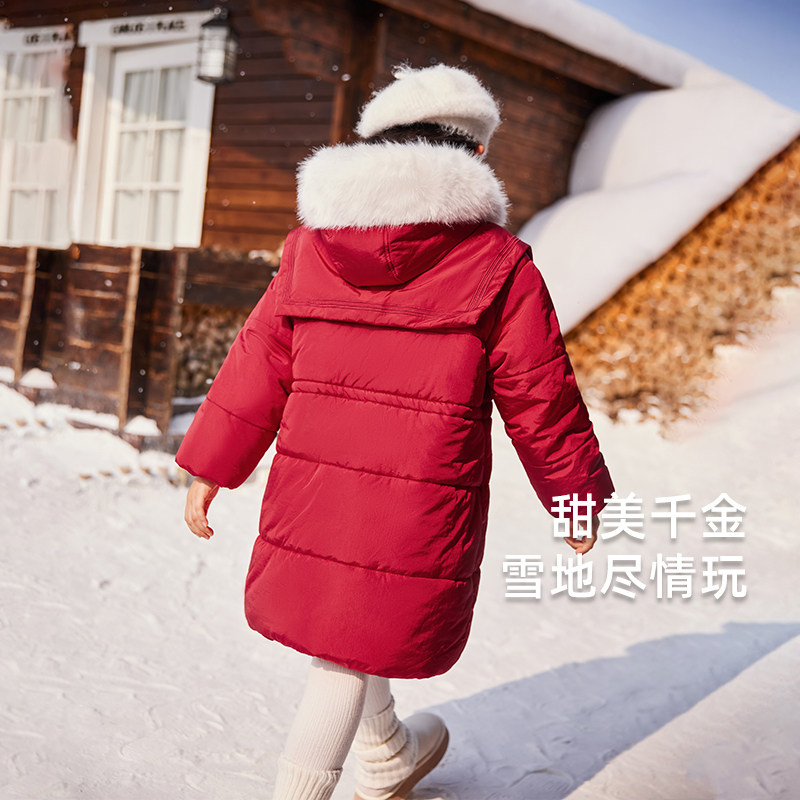[远红外锁温]女童红色棉服冬季中大童夹棉中长款儿童连帽宝宝冬装
