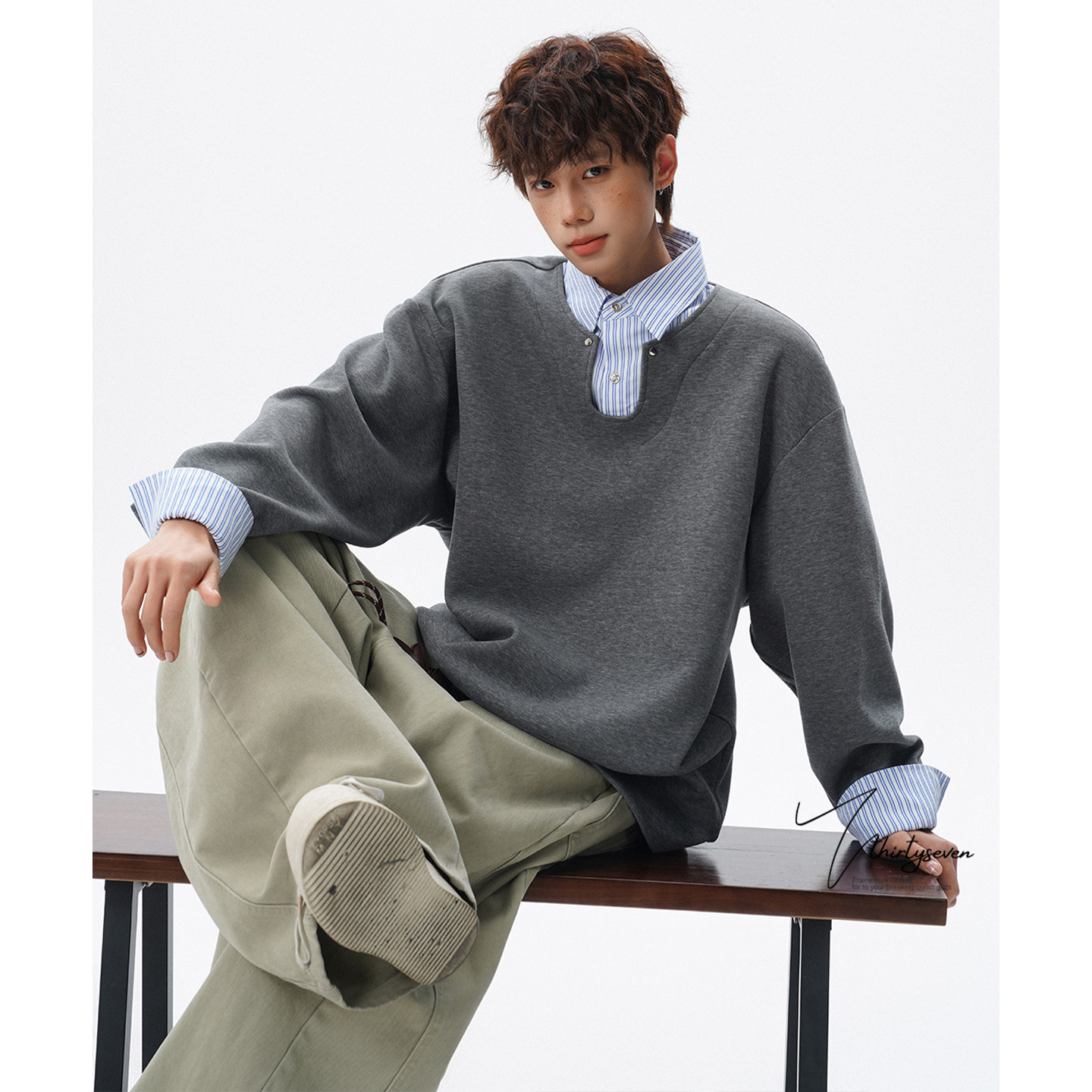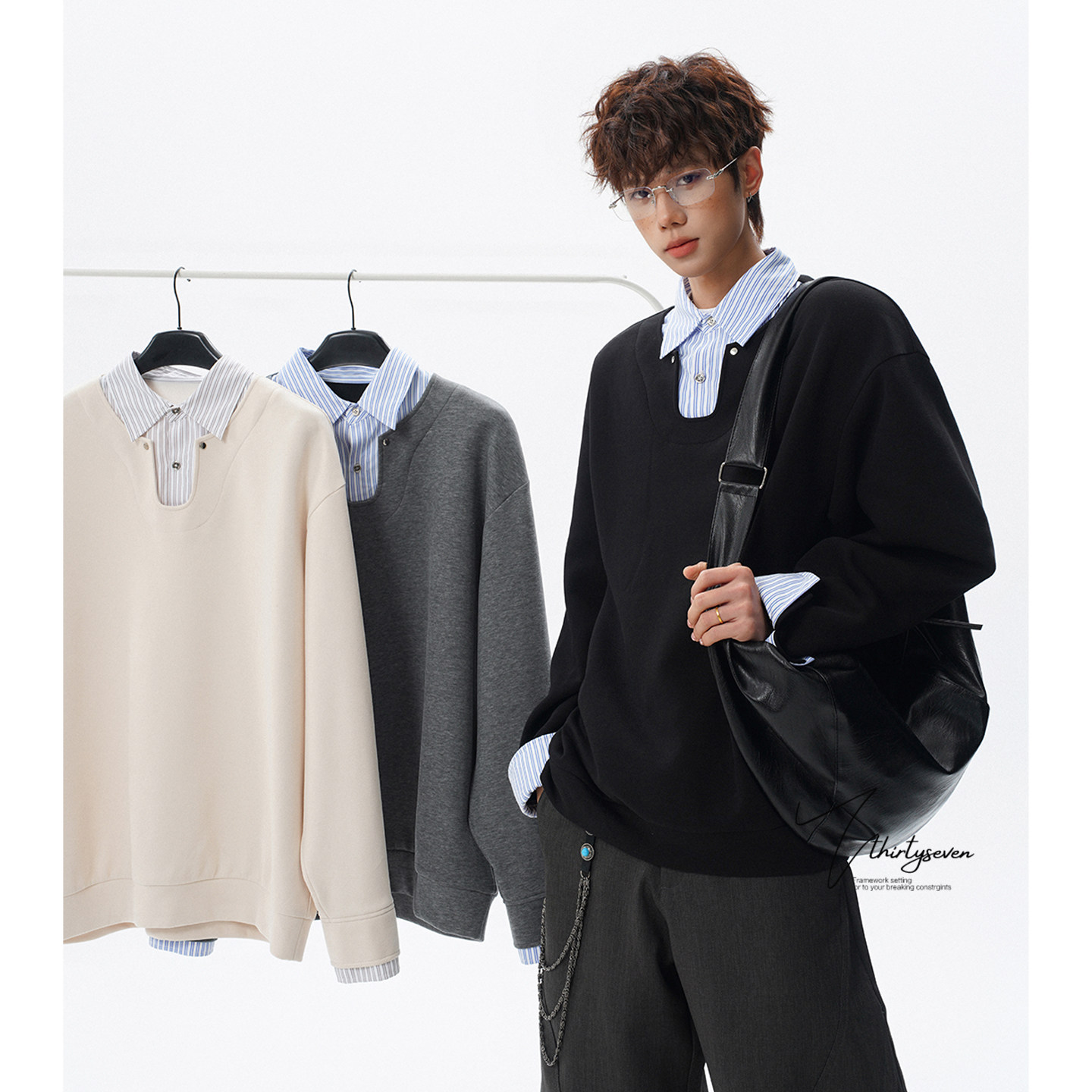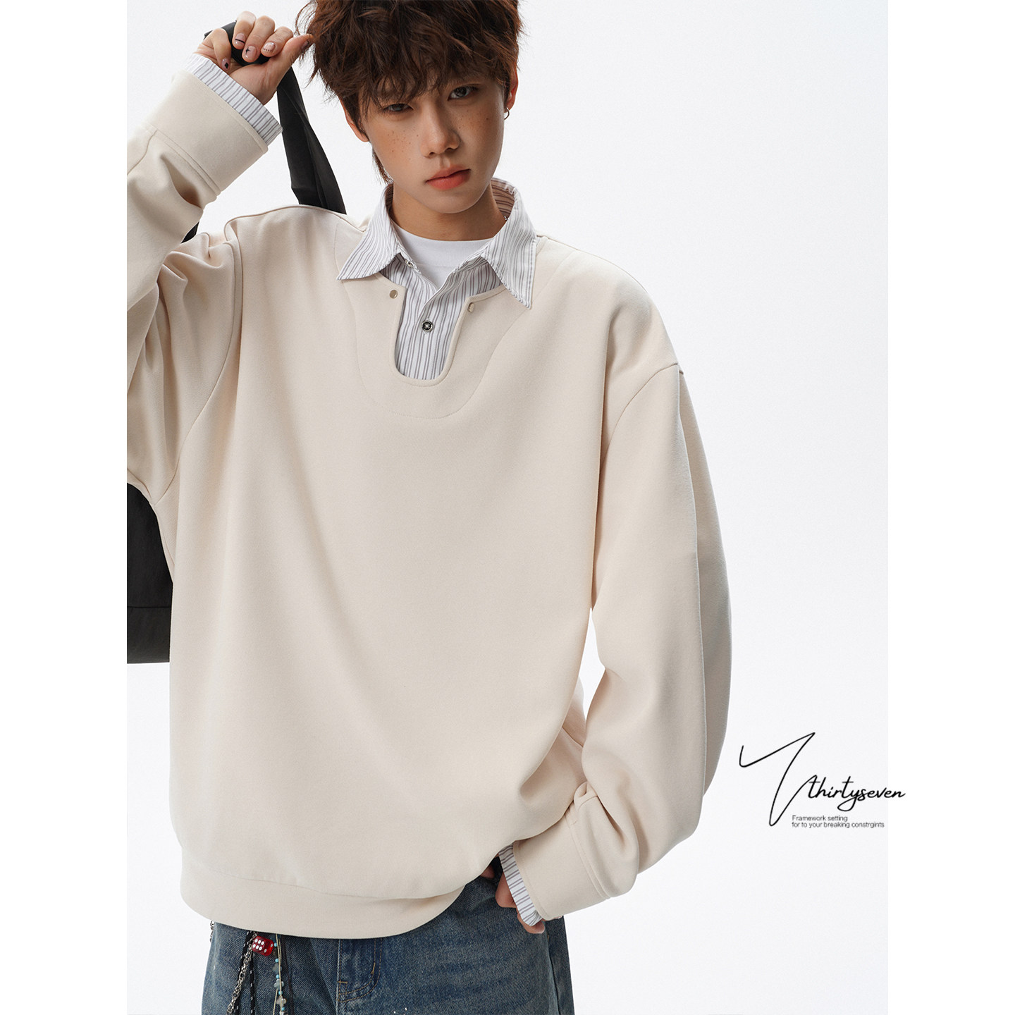 V37美式潮牌学院风衬衫领假两件卫衣男春设计感宽松百搭拼接上衣