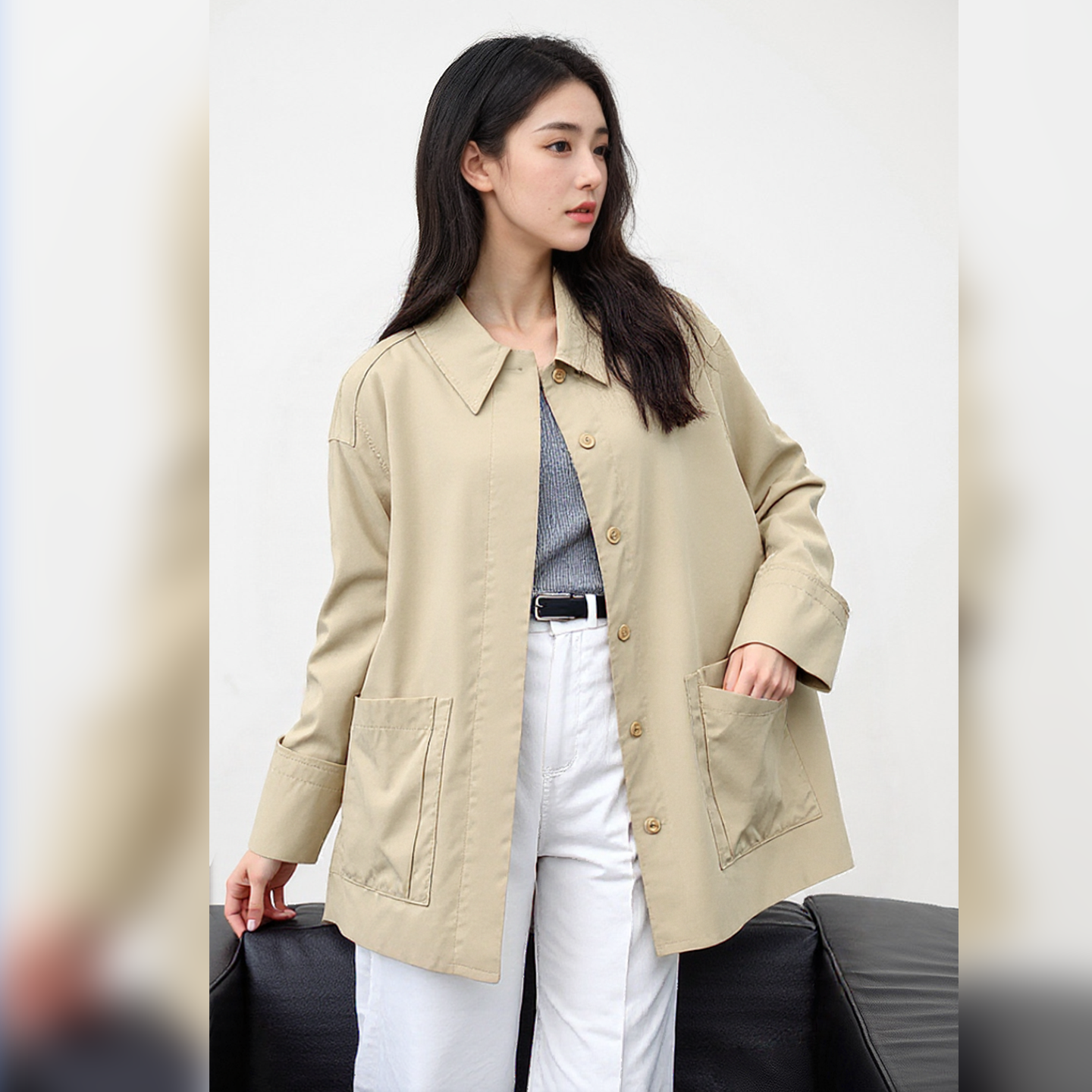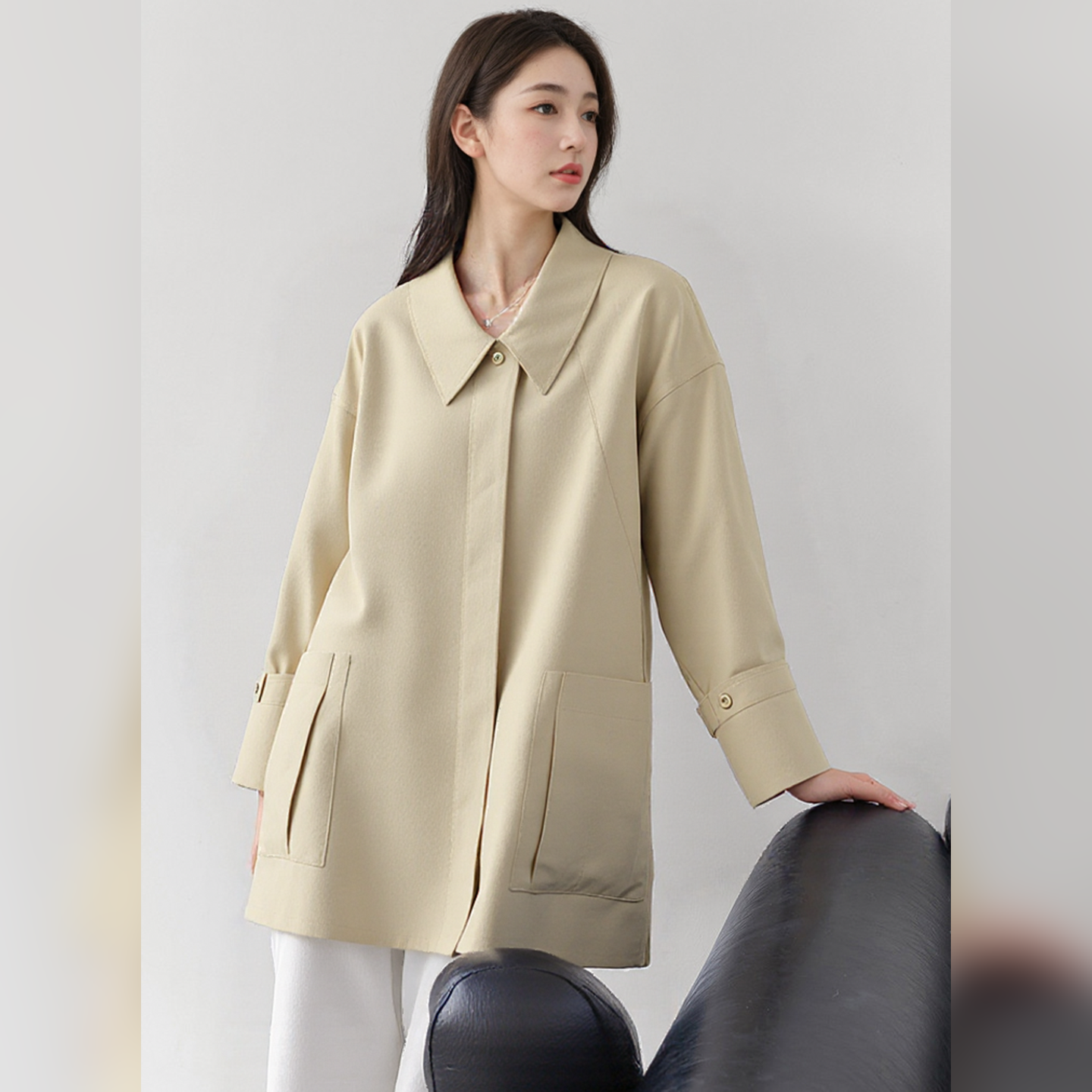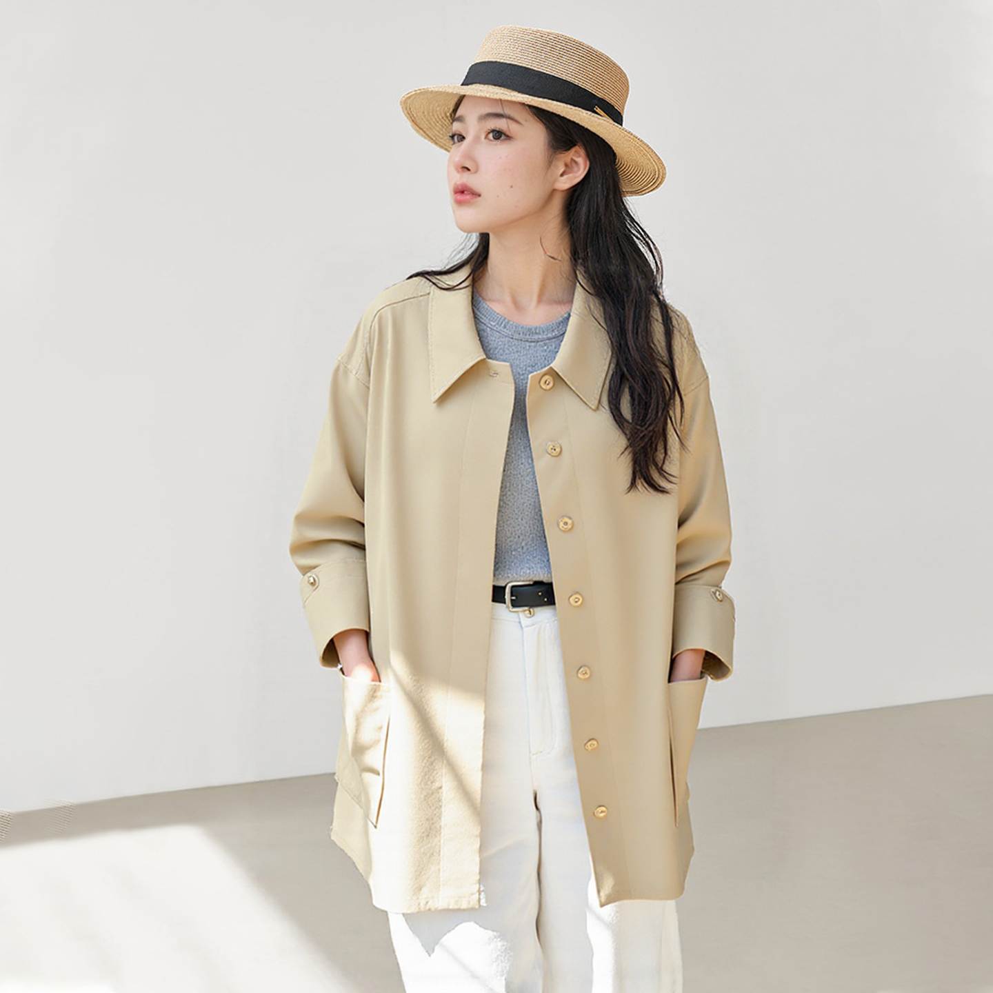 极简松弛浅卡其风衣女2025秋新款A字廓形大贴袋藏肉显瘦通勤外套