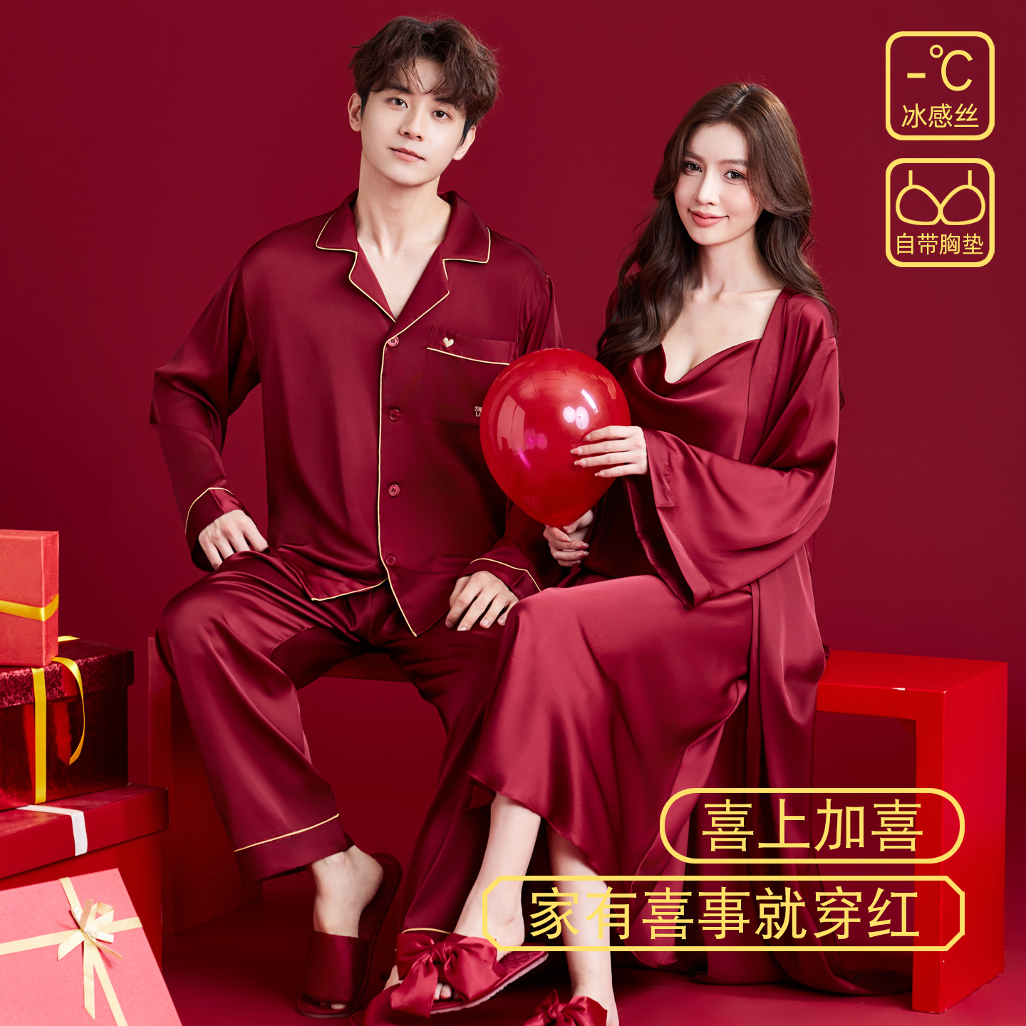 乐姿梦红色情侣睡衣冰丝春秋季结婚晨袍带胸垫女睡裙家居服男套装