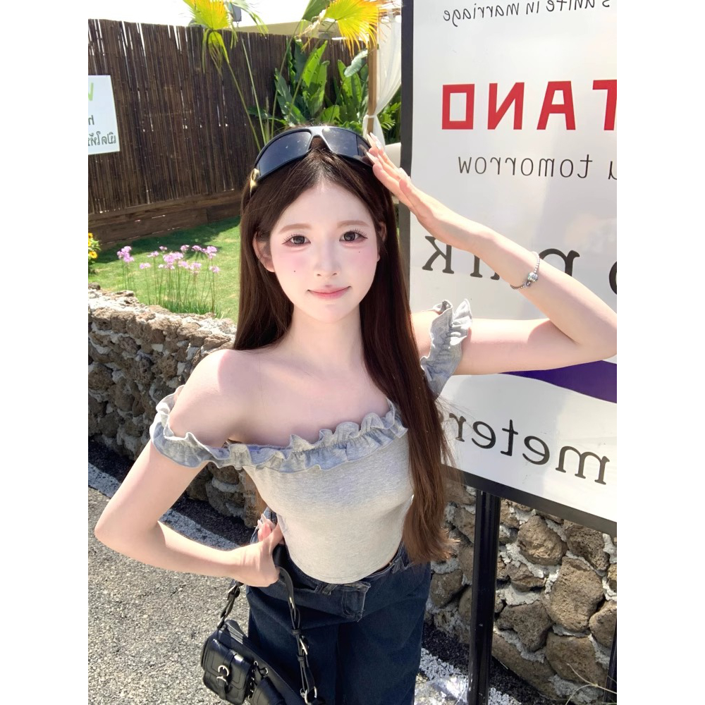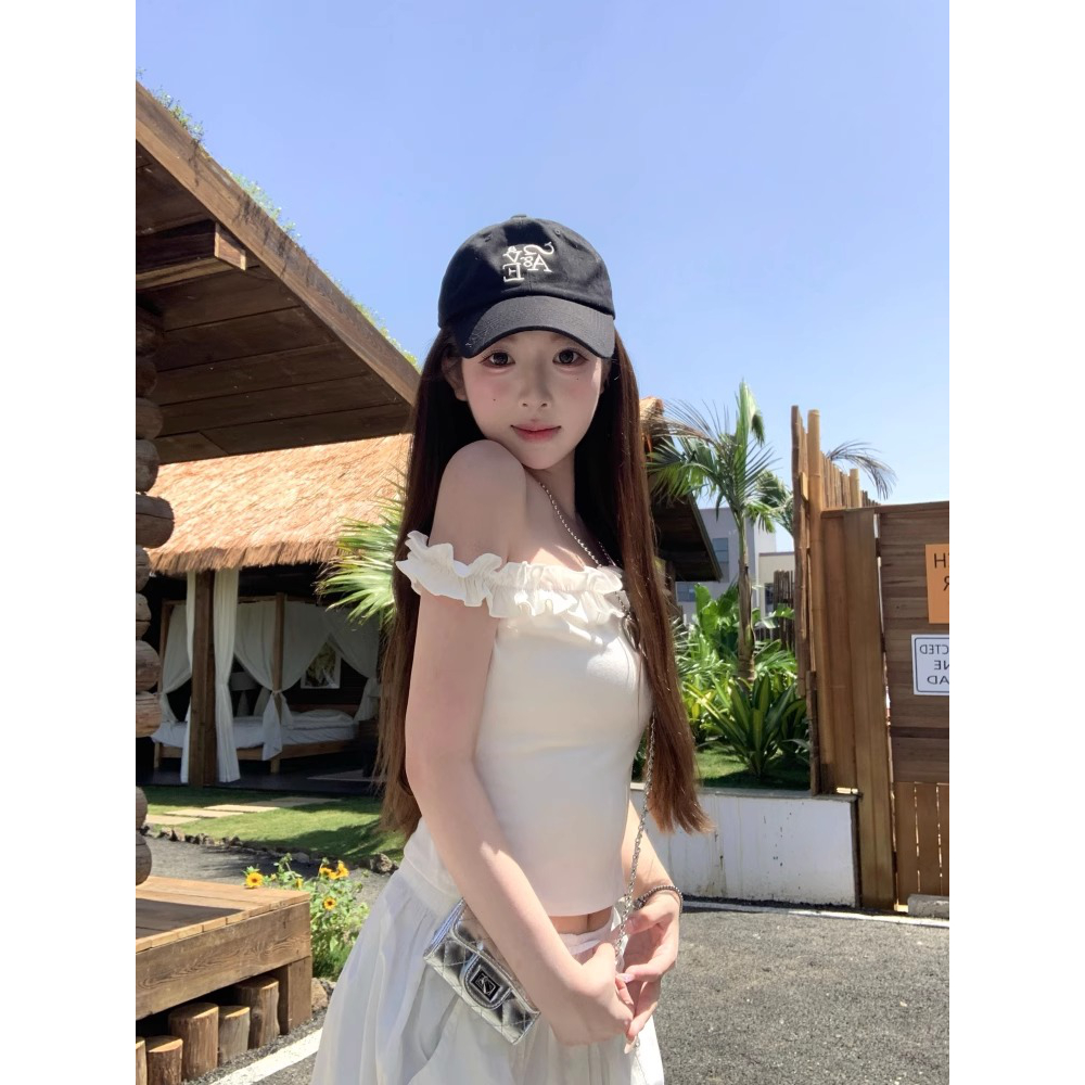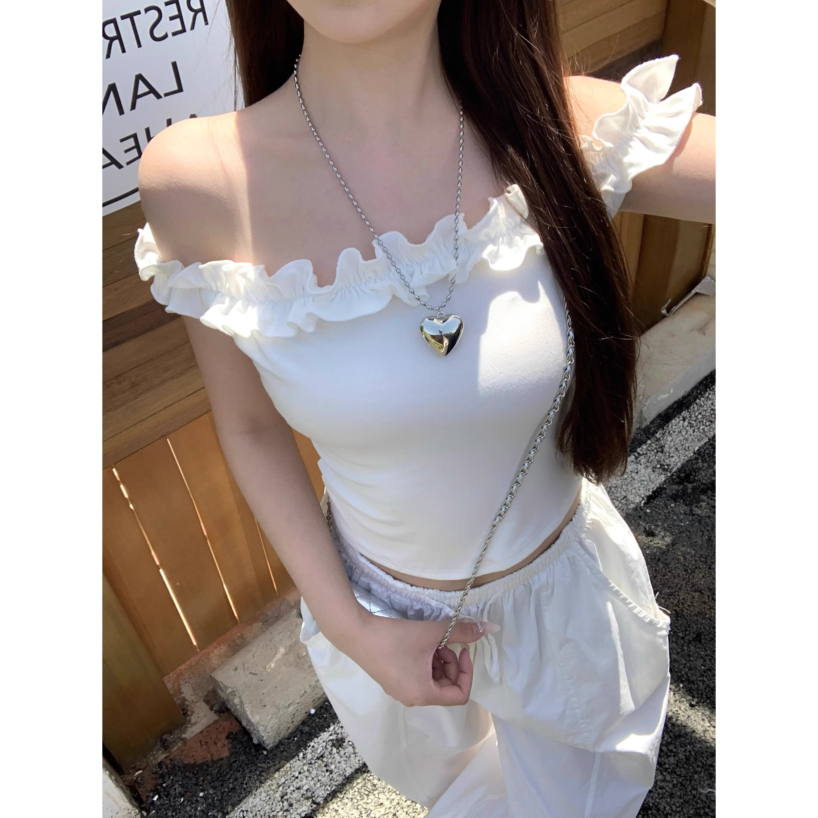 一字肩木耳边无袖T恤女夏季修身白色辣妹设计感紧身短款百搭上衣