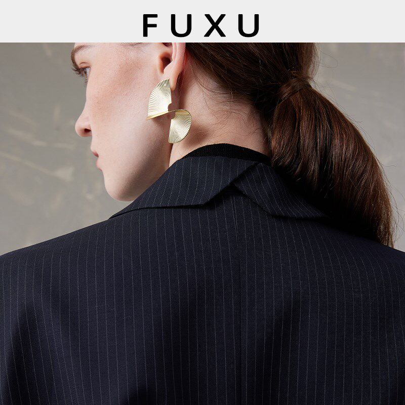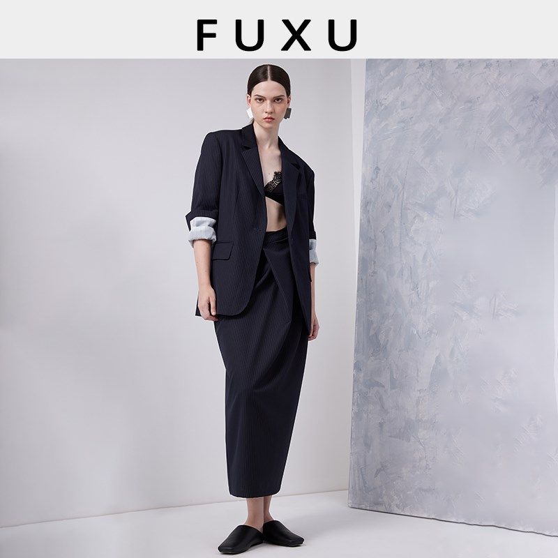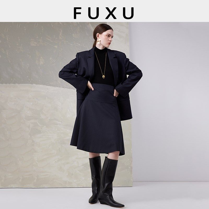 芙蕖FUXU 精纺羊毛老钱风宽松显瘦条纹平驳领西装A字半身裙套装女