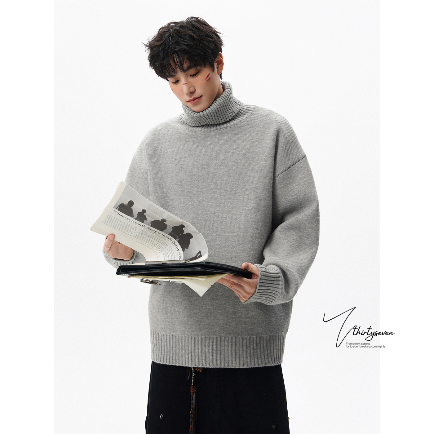 V37美式基础款纯色高翻领针织毛衣男冬季宽松慵懒风加绒套头线衫