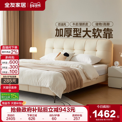全友家居奶油风1米5单人储物床2025新款主卧室高脚1米8真皮双人床