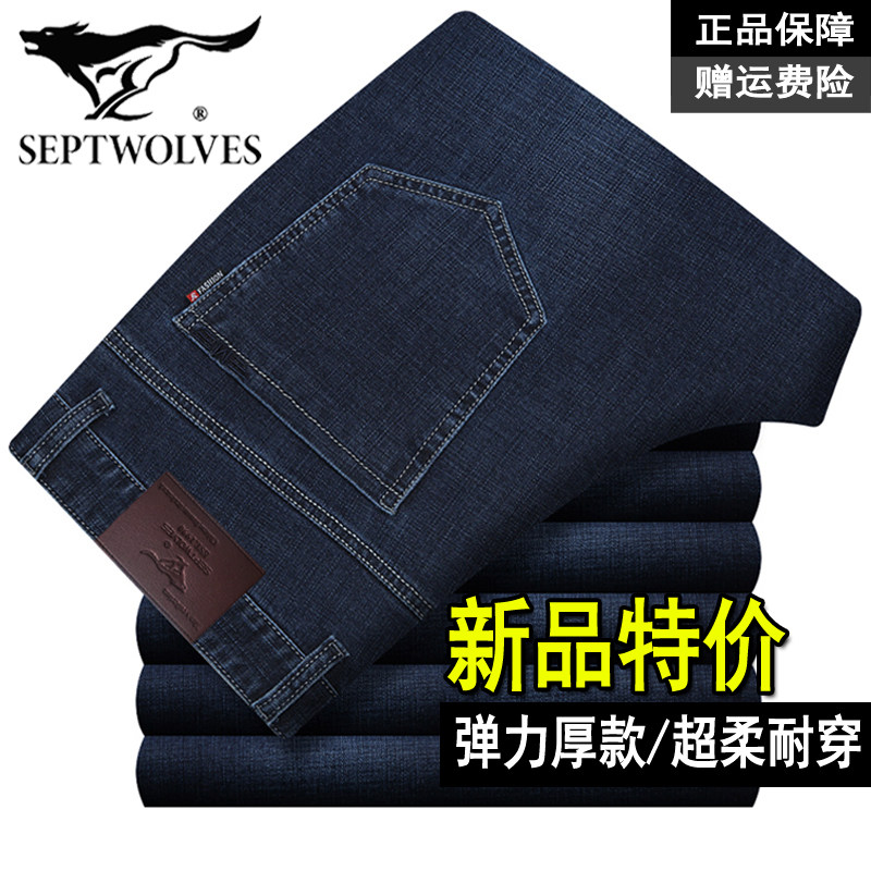 七匹狼特价秋冬厚款弹力男士牛仔裤高腰宽松直筒裤中年商务休闲裤