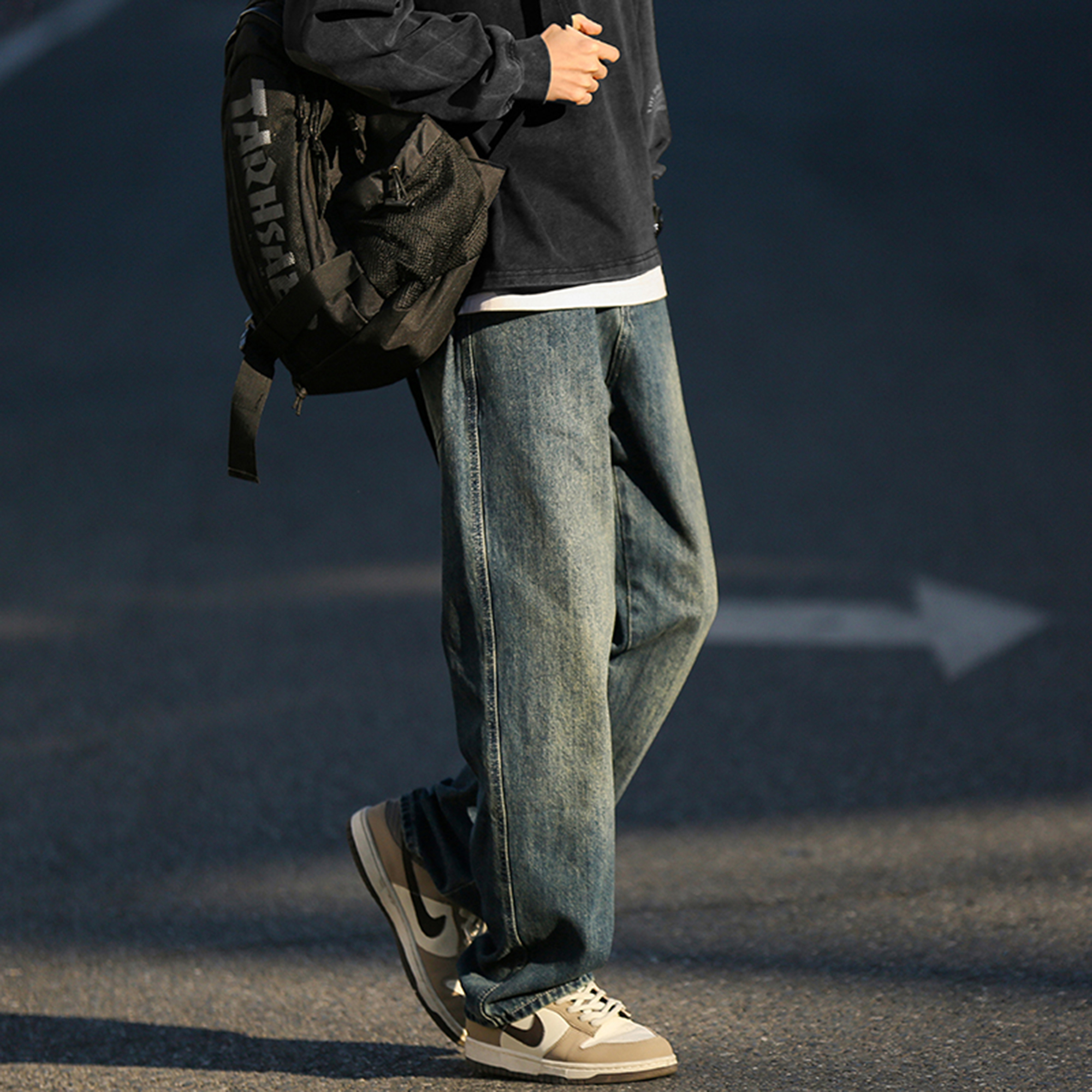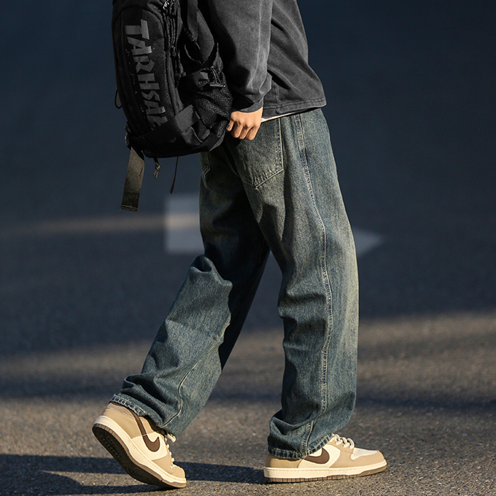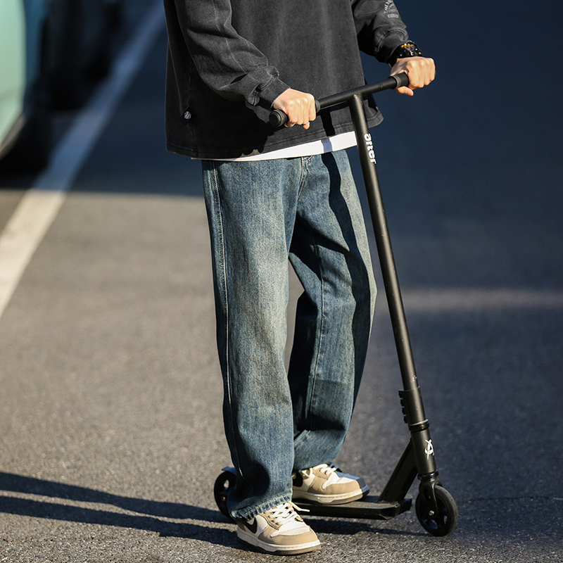 @港仔文艺男 水洗牛仔裤男秋冬男生宽松直筒美式休闲阔腿裤子男款