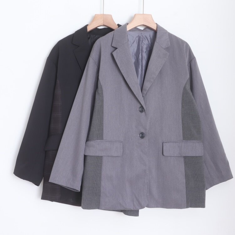 D18099日单新款贵牌1.1W单排扣宽松拼接格子女气质休闲西装外套