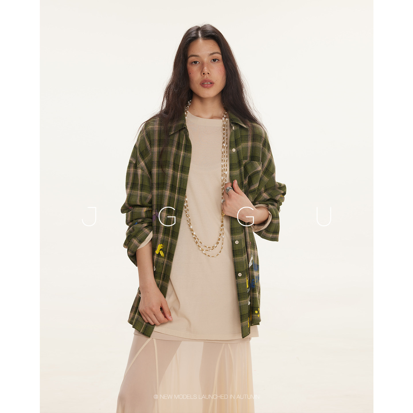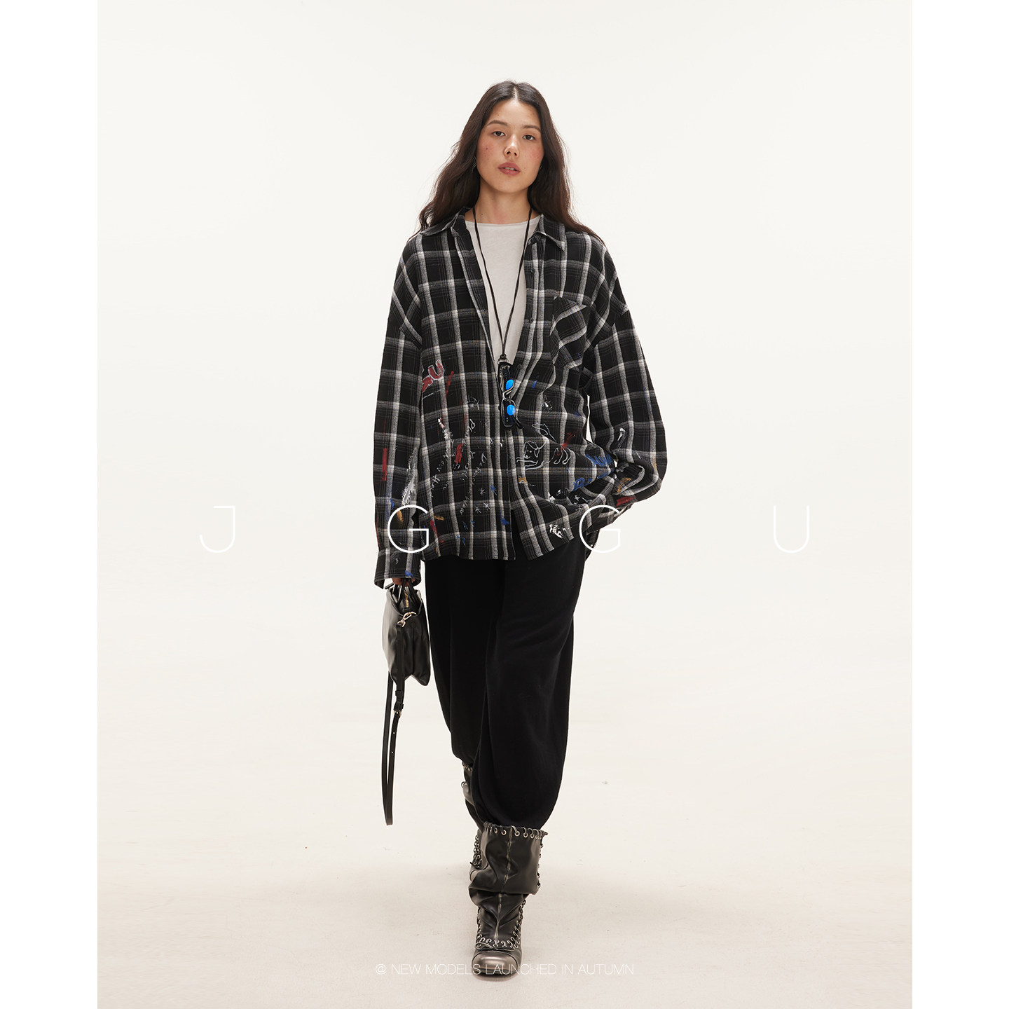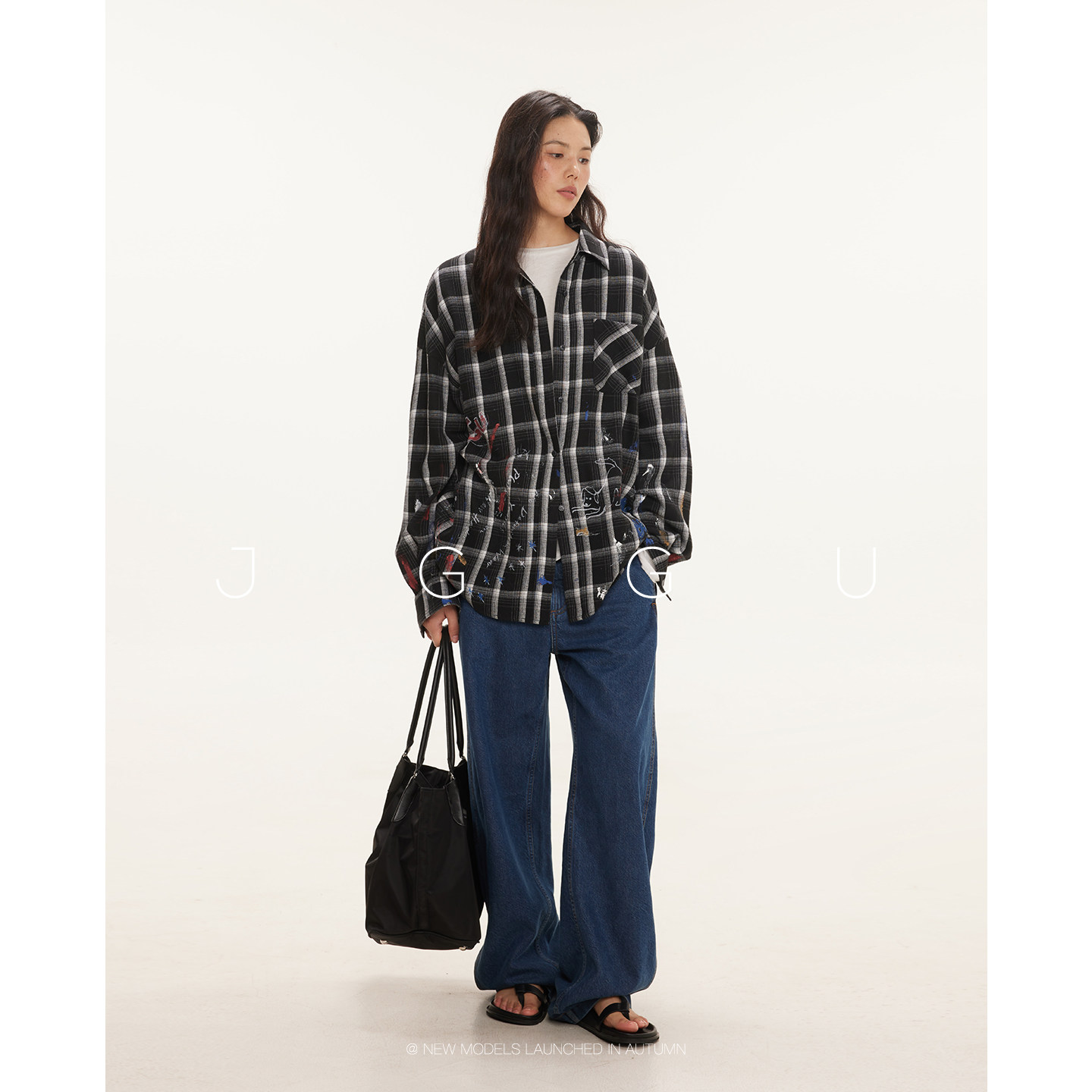 晶咕黑标JGGU【泽西女高】 大码复古印花格纹宽松显瘦衬衫女秋季