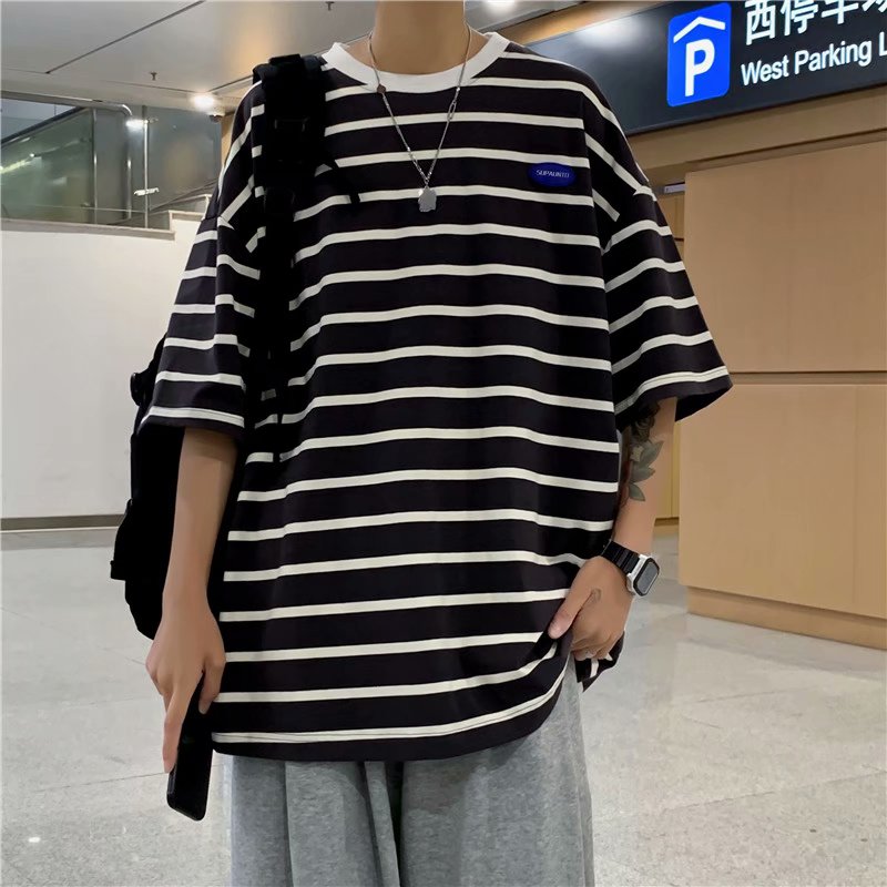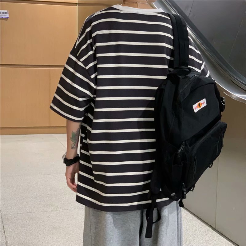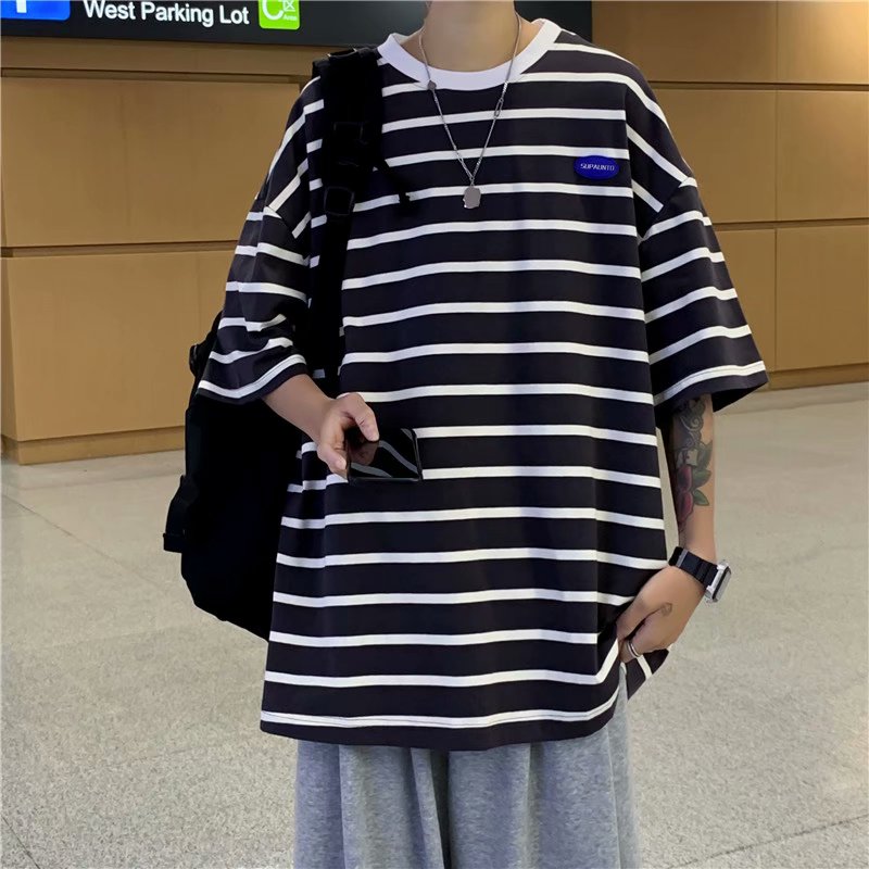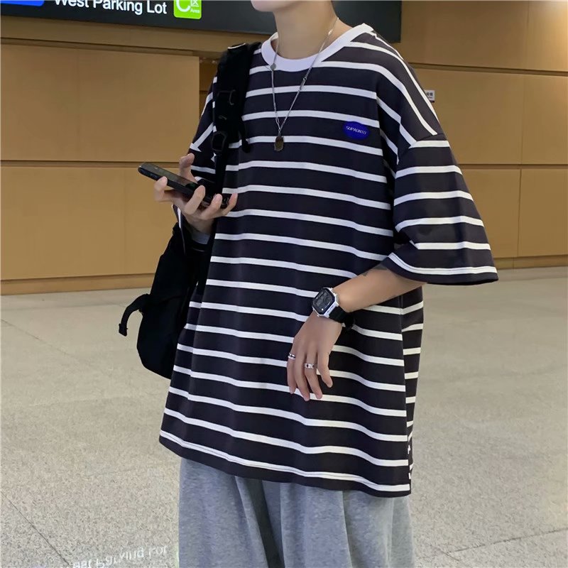 夏季纯棉条纹t恤男短袖圆领ins休闲学生韩版潮流百搭港风宽松半袖