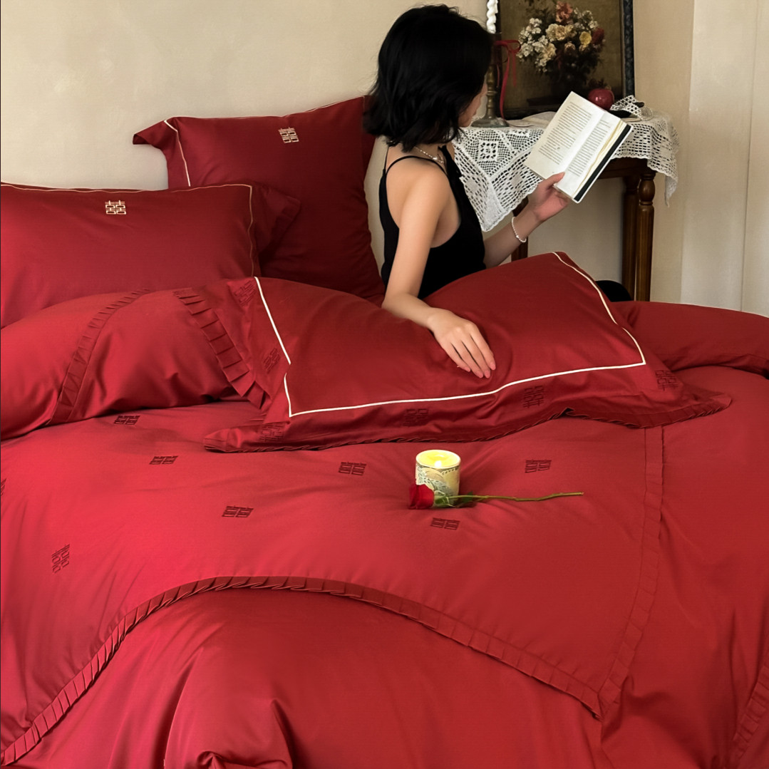 双喜刺绣100S全棉婚庆四件套红色喜庆结婚房纯棉被套床单床上用品