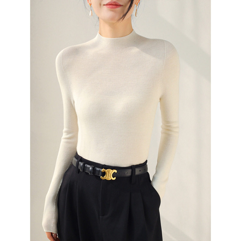 高端扬子纱半高领无缝一体套头针织衫女秋修身全羊毛打底毛衣白色
