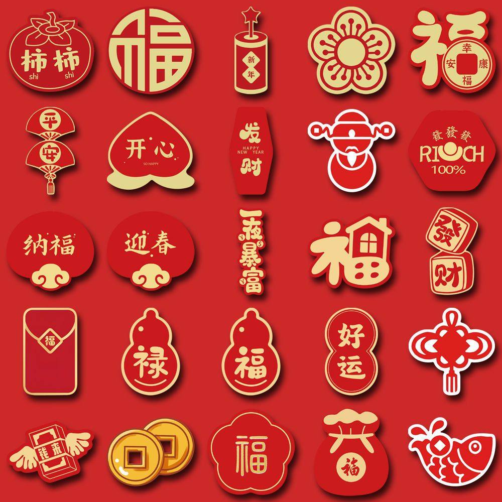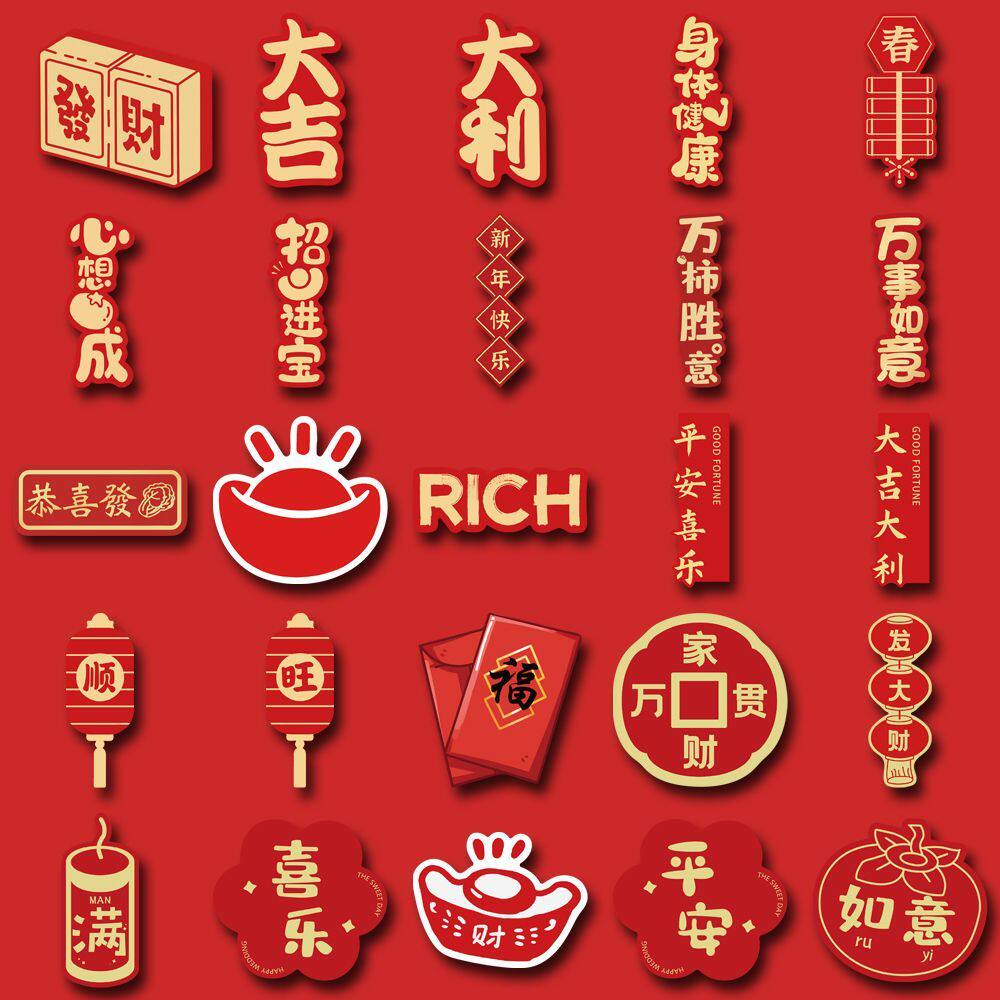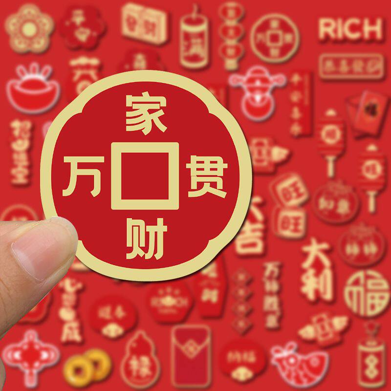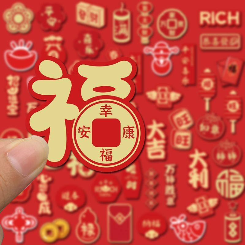 52张春节装饰喜庆祝福招财高颜值创意手账贴画防水贴纸diy手机壳平板ipad行李箱钱包装饰自粘贴桌面小贴画