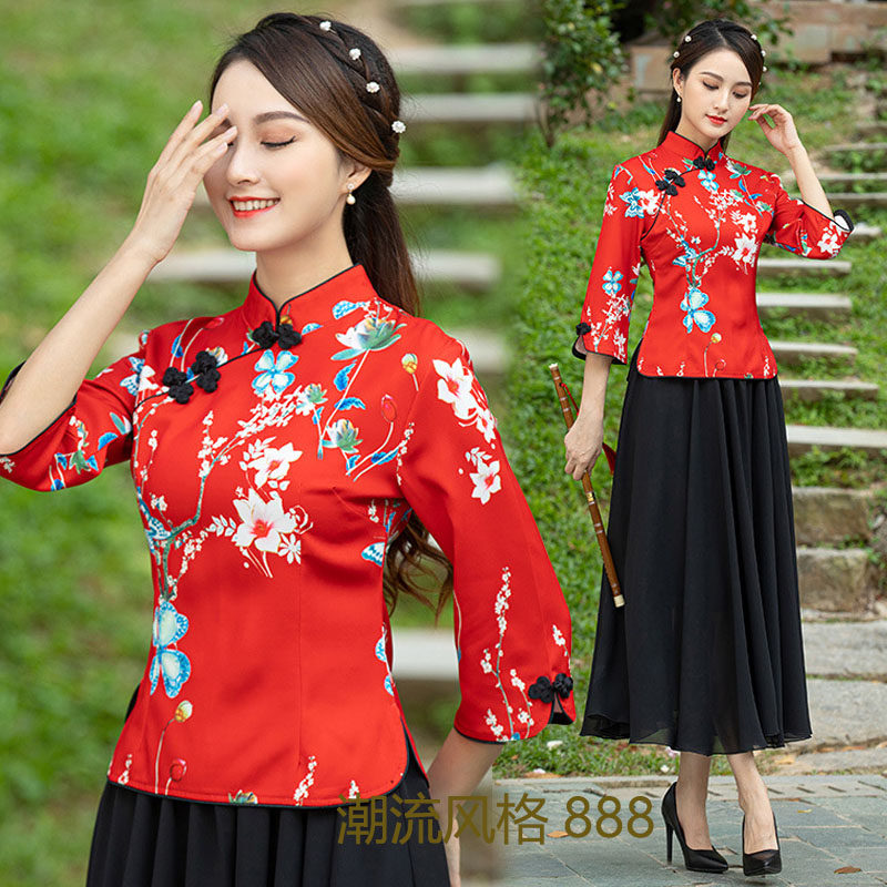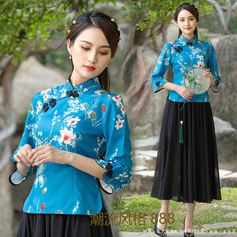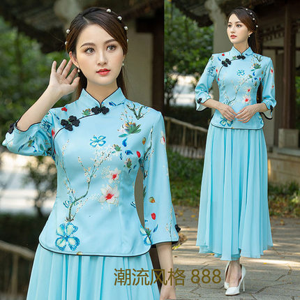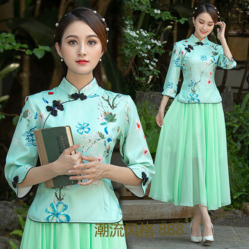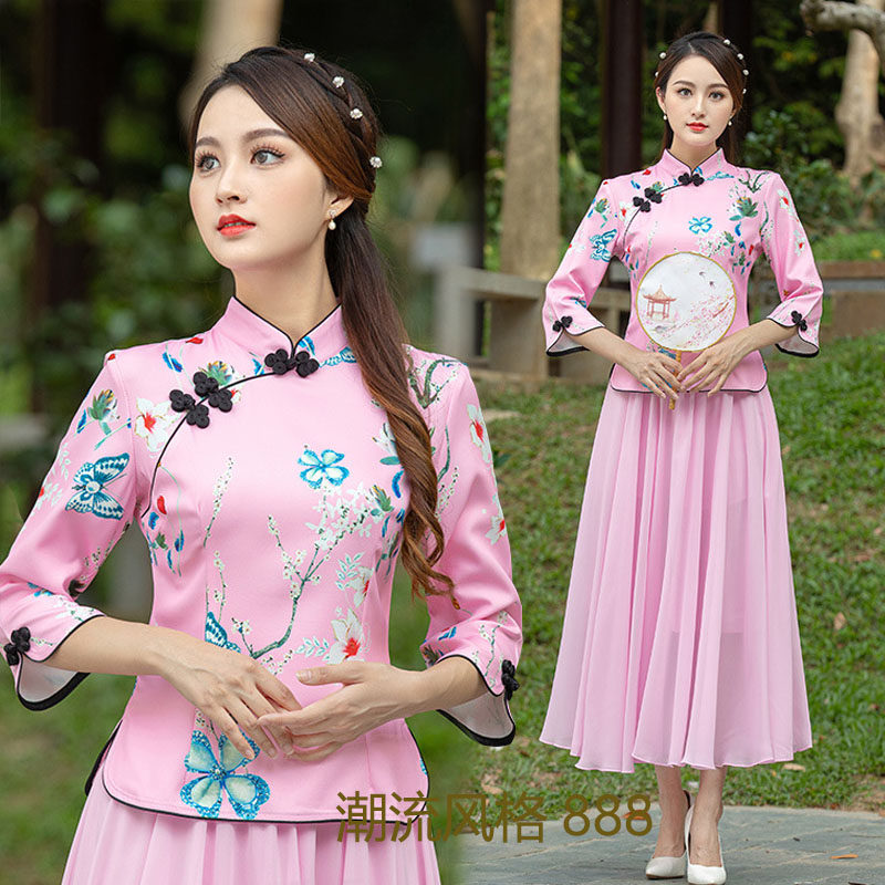 夏季旗袍两件套中式日常锦棉时尚大码修身唐装表演茶服印花女上衣