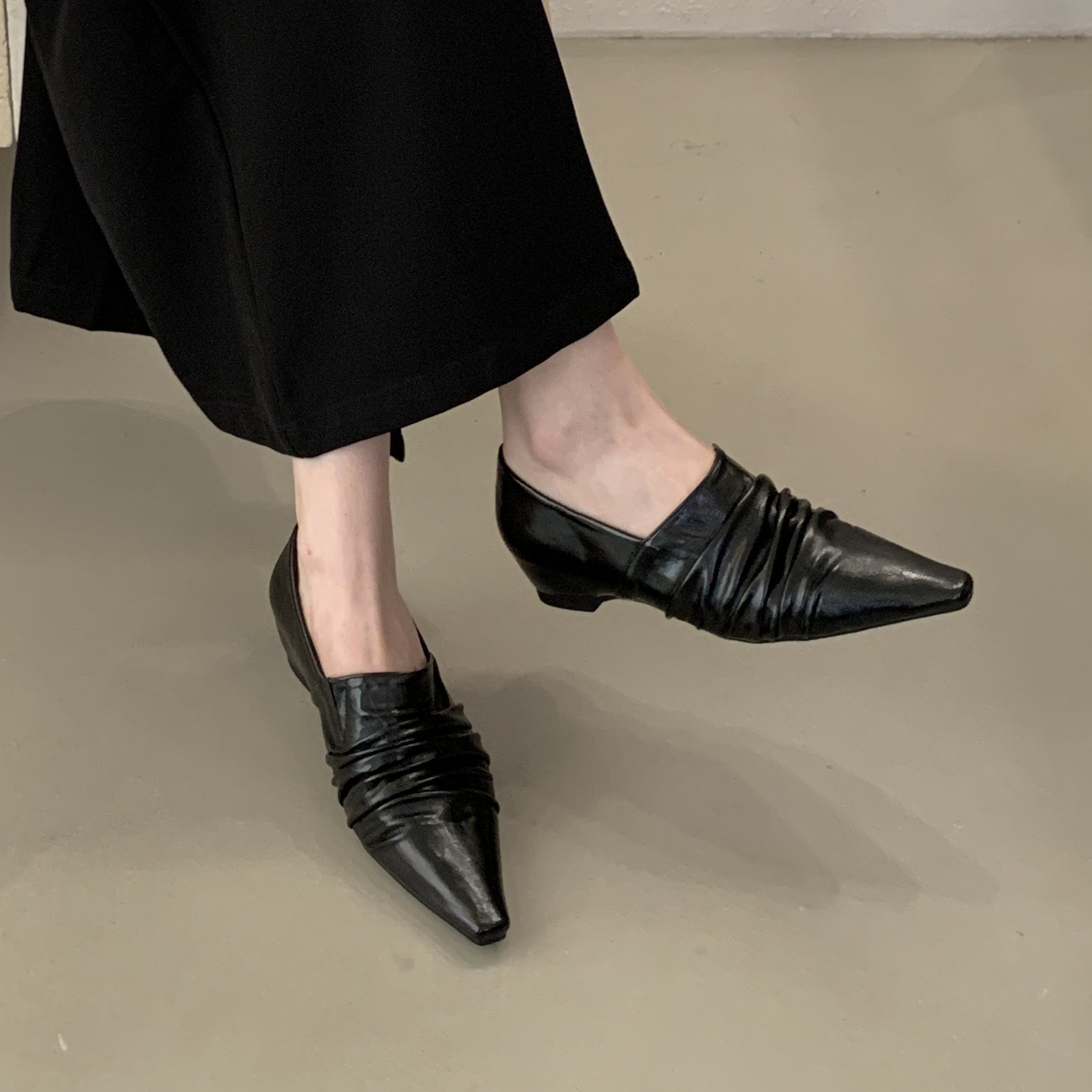 2026早春季新款尖头粗跟高跟鞋通勤浅口女单鞋内增高褶皱小皮鞋子